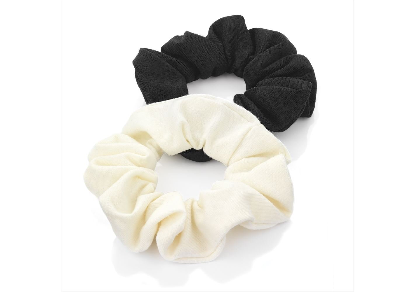 * Two pack of hair scrunchie bobbles * One black and one cream * Soft jersey style fabric * 80% cotton, 20% polyester * Measure 14cm round by 3cm wide * All measurements approximate across widest points and with relaxed elastic