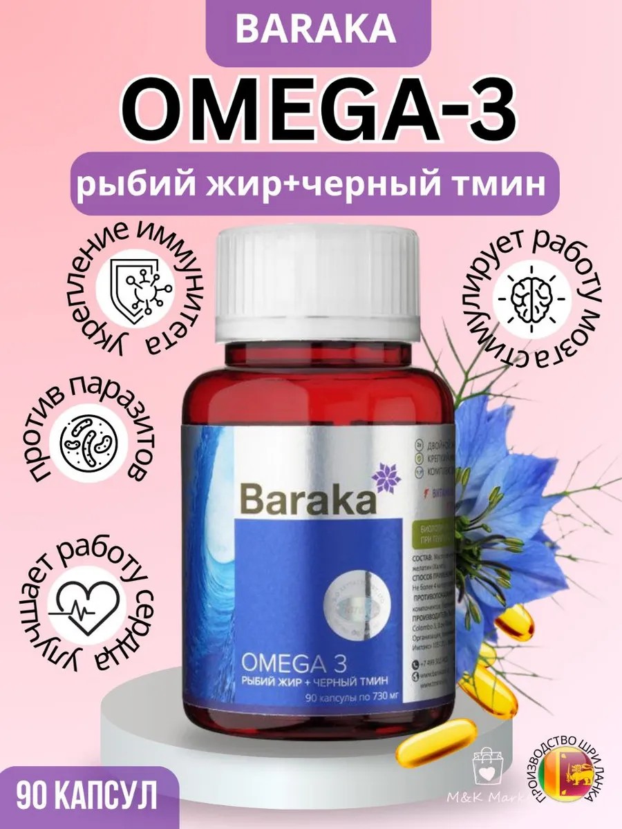 Капсулы Baraka, содержащие омега-3 рыбий жир из рыбы трески и масло черного тмина, представляют собой мощное средство для поддержания и улучшения здоровья. Благодаря синергетическому эффекту этих двух компонентов, капсулы оказывают комплексное воздействие на сердечно-сосудистую систему, мозг, иммунную систему и общее состояние организма. Омега-3 помогают улучшить функции сердца и мозга, в то время как масло черного тмина укрепляет иммунитет и уменьшает воспаление. Совместное использование этих добавок может быть отличным дополнением к здоровому образу жизни и рациону, помогая поддерживать здоровье на высоком уровне. Baraka представляет уникальный антипаразитарный комплекс, который содержит масло черного тмина и рыбий жир в капсулах. Этот премиум комплекс витаминов подходит для женщин, мужчин и детей. Omega 3-6-9 капсулы являются идеальным выбором для поддержания здоровья волос, омега-3 для детей обеспечивает сбалансированное питание во время отдыха на море. Витамины для женщин из состава Baraka содержат не только рыбий жир, но и черный тмин, что делает этот продукт уникальным и эффективным. Комплекс витаминов помогает бороться с выпадением волос благодаря своему богатому составу. Omega 3 капсулы - незаменимый помощник в поддержании здоровья и красоты. Они обладают высоким содержанием витаминов для волос, что делает их отличным выбором для укрепления локонов. Baraka создан, чтобы обеспечить вашу семью ценными элементами питания. Наслаждайтесь всеми преимуществами витаминов с черным тмином и рыбьим жиром в одной удобной капсуле!