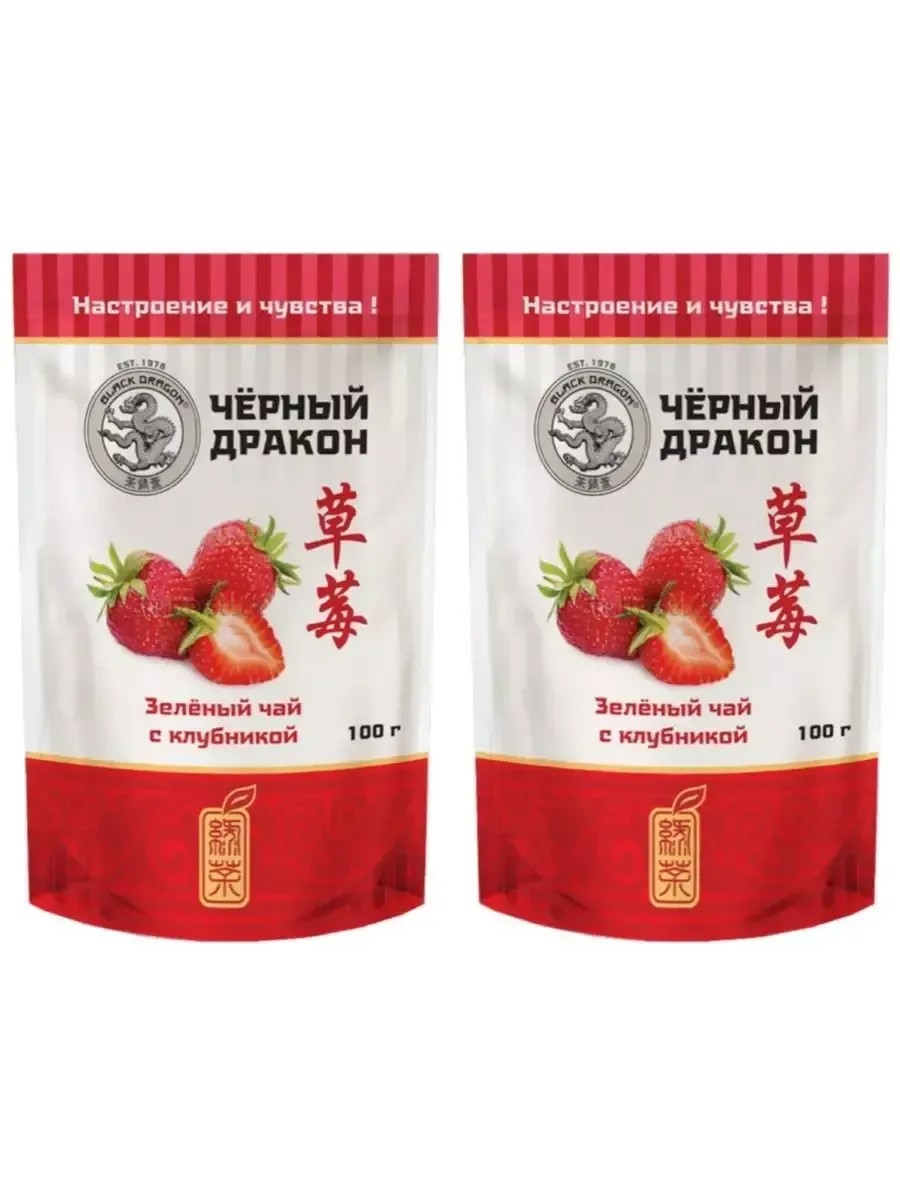 Черный Дракон, чай зеленый с клубникой. В комплекте 2 упаковки по 100 г. Зеленый чай с кусочками клубники, приятный ароматный напиток с общеукрепляющими свойствами. Зеленый чай не проходит ферментацию, что позволяет сохранить множество витаминов и микроэлементов, а также важные для организма аминокислоты. Полезные вещества легко экстрагируются в настой и хорошо усваиваются организмом. Сушеные ягоды клубники издавна используются в Китае для добавления в чай. Ароматные кусочки содержат фолиевую кислоту и так называемый гормон радости, эндорфин и придают чаю дополнительную витаминизацию.