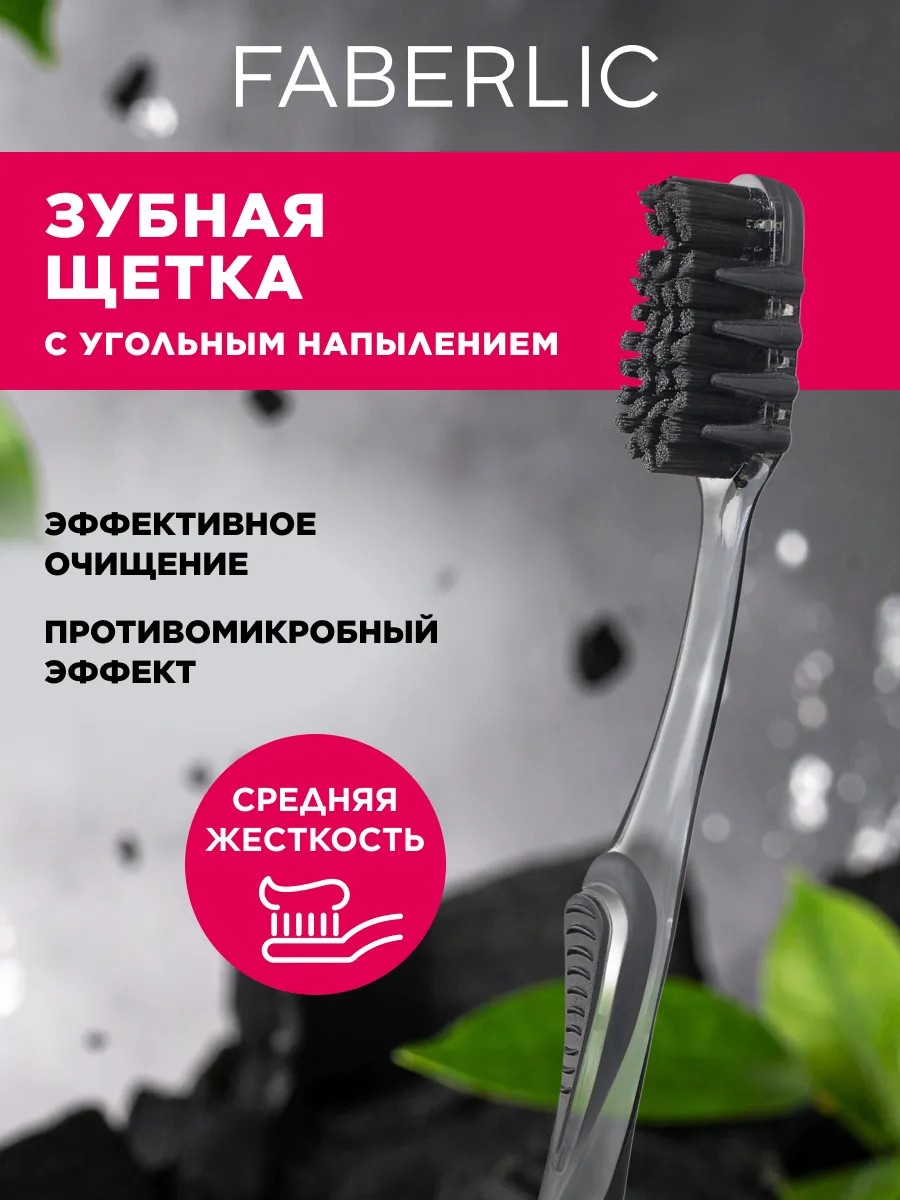 Зубная щетка средней жесткости взрослая черная от Faberlic . Щетка для чистки зубов Фаберлик эффективно очищает зубы , качественно справляется с налетом , оказывает отбеливающий эффект , угольная щеточка . Благодаря антисептическим свойствам угля обеззараживает полость рта . Силиконовые элементы по краям предназначены для массажа чувствительных дёсен . Щетинки разной длины легко очищают межзубные промежутки и труднодоступные места . Зубные щетки имеют среднюю жесткость . Отличный выбор для комплексного уход за полостью рта . Можно составить уникальный подарочный набор для всей семьи . Здоровье и красота ваших зубов . Ручка пластик , щетина нейлон .