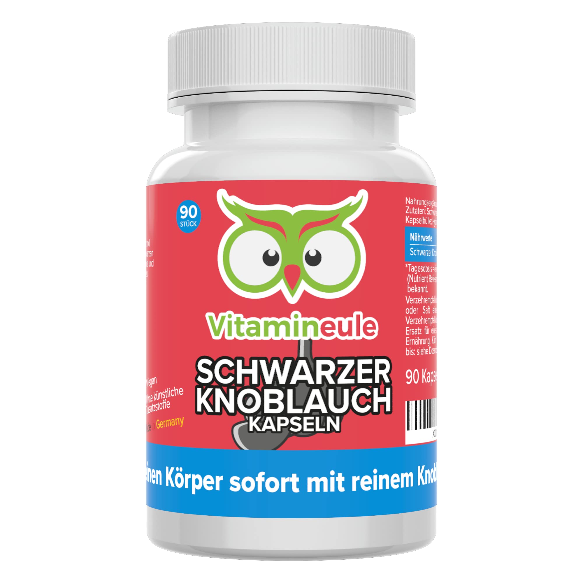 Our satisfaction guarantee - our products are carefully produced, packed and sent.If you are still not satisfied, you can return the item within six months and receive uncomplicated reimbursement.Made in Germany laboratory testing - the production takes place according to the FSSC 22000 safety standard, the strictest certification for food safety in Germany.Every batch and all raw materials used are extensively tested by accredited laboratories for all loads.Without additives vegan - our black garlic capsules are free of additives.This includes z.B. fillers such as microcrystalline cellulose or magnesium stearate, all auxiliary substances, press aids, magnesium salts, calcium phosphate, ethylene oxide, silicon dioxide, PEG and carrageen.We also avoid genetic engineering, dyes, flavors, sugar, lactose and gluten.Our black garlic capsules are also free of all allergens, suitable for children and 100 vegan.Effective active ingredient-our concentrated garlic extract contains a variety of secondary plant substances and flavonoids, which have a strong, antioxidant effect.High -dose black garlic capsules are used, for example, on topics such as heart health, anti -inflammatory inhibition, immune conversion and neuroprotection.The extract made by fermentation is odorless and enables pleasant intake.High-dosed fast effect-our black garlic capsules contain 500 mg pure garlic extract.With a high proportion of S-allylcysteine (SAC).The extraction ratio is 10: 1.This corresponds to 5,000 mg pure garlic powder per capsule.The occurrence of action takes place quickly and effectively.A can contains 90 capsules.The capsules can be opened and the powder can be dissolved in water or juice.UNSERE ZUFRIEDENHEITSGARANTIE - Unsere Produkte werden sorgfältig produziert, verpackt und versendet. Solltest du dennoch einmal nicht zufrieden sein, kannst du den Artikel innerhalb von sechs Monaten zurückgeben und erhältst eine unkomplizierte Erstattung. IN DEUTSCHLAND HERGESTELLT LABORGEPRÜFT – Die Produktion erfolgt nach der Sicherheitsnorm FSSC 22000, der strengsten Zertifizierung für Lebensmittelsicherheit in Deutschland. Jede Charge und alle verwendeten Rohstoffe werden von akkreditierten Laboren umfassend auf sämtliche Belastungen getestet. OHNE ZUSATZSTOFFE VEGAN – Unsere Schwarzer Knoblauch Kapseln sind frei von Zusatzstoffen. Hierzu zählen z. B. Füllstoffe wie mikrokristalline Cellulose oder Magnesiumstearat, jegliche Hilfsstoffe, Presshilfen, Magnesiumsalze, Calciumphosphat, Ethylenoxid, Siliziumdioxid, PEG und Carrageen. Ebenfalls verzichten wir auf Gentechnik, Farbstoffe, Aromen, Zucker, Laktose und Gluten. Unsere Schwarzer Knoblauch Kapseln sind zudem frei von sämtlichen Allergenen, für Kinder geeignet und zu 100 vegan. EFFEKTIVER WIRKSTOFF – Unser konzentrierter Knoblauch-Extrakt enthält eine Vielzahl an sekundären Pflanzenstoffen und Flavonoiden, welche eine starke, antioxidative Wirkung aufweisen. Hochdosierte Schwarzer Knoblauch Kapseln werden beispielsweise bei Themen wie Herzgesundheit, Entzündungshemmung, Immunstärkung und Neuroprotektion eingesetzt. Der durch Fermentation hergestellte Extrakt ist geruchlos und ermöglicht eine angenehme Einnahme. HOCHDOSIERT SCHNELLE WIRKUNG – Unsere Schwarzer Knoblauch Kapseln enthalten 500 mg reinen Knoblauch-Extrakt. mit einem hohen Anteil an S-Allylcystein (SAC). Das Extraktionsverhältnis beträgt 10:1. Dies entspricht 5.000 mg reinem Knoblauchpulver pro Kapsel. Der Wirkungseintritt erfolgt schnell und effektiv. Eine Dose enthält 90 Kapseln. Die Kapseln können geöffnet und das Pulver in Wasser oder Saft aufgelöst werden.Schwarzer Knoblauch Kapseln - hochdosiert - 500 mg Extrakt (10:1) - fermentiert - geruchlos - mit S-Allylcystein (SAC) - Qualität aus Deutschland - ohne Zusätze - vegan - laborgeprüft - Vitamineule