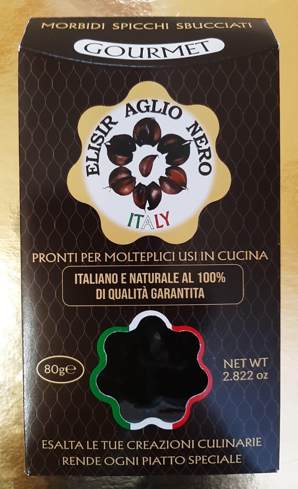 Black Garlic ELIXIR BLACK GARLIC ITALY Ideal for seasoning a variety of dishes from starters, pastas and risotto to second courses, meat and fish or for spreading croutons with slices of mozzarella, vegetables or for whatever your imagination suggests. In addition, it can replace fresh garlic in all classic kitchen preparations such as: sauces, roasts with baked potatoes and sautéed vegetables, finally and simply mixed idyllically chopped with vegetable salads. It adds an exotic touch to dishes, for those interested in international and healthy cuisine. It is a powerful antioxidant that offers many benefits, including supporting the immune system, fighting free radicals responsible for aging, and stimulating the production of collagen, this fundamental protein for youthful skin. It can also be useful for children to increase their concentration before taking exams, because it is rich in potassium, phosphorus, calcium, selenium then there is vitamin C and some B vitamins. So Black Garlic has a totally different flavor from common raw garlic, it is not pungent, it does not cause bad breath problems, because the fermentation process reduces the allicin, and other components present in fresh garlic are transformed into sugars, so it is digested more. easily. Black Garlic has been defined as the champion of SuperFoods by experts as a true ELIXIR for everyone's health. Tips for preparing BLACK GARLIC ELIXIR ITALY Start by frying the black garlic cloves in a little extra virgin olive oil, add a pinch of salt and hot water mash the resulting mixture with a fork. If you want a creamier sauce, add a little boiled potato or for a more dynamic mixture add a few anchovy fillets in the oil. Use to season pasta, risotto, meat and fish or to spread on bruschetta. Cloves can be used in dishes directly in slices or pieces or, likewise, as a final decoration of your dishes4. Rich in antioxidants. 3. It is a versatile and refined ingredient to enhance your culinary creations, it makes every dish special, ideal to surprise and delight the most demanding palates by offering a unique and unforgettable gastronomic experience. 2. The peeled tender segments will surprise you with their delicious taste balanced between sweet and salty, similar to licorice and the delicate scent of truffle, ready for multiple uses in the kitchen. 1. ELIXIR OF BLACK GARLIC ITALY Gourmet Product of Excellence, entirely Made in Italy, presented in an Elegant Packaging, it is ideal for making an Original Gift. Ail Noir ELIXIR BLACK GARLIC ITALY Idéal pour assaisonner une variété de plats depuis les entrées, les pâtes et le risotto jusqu'aux seconds plats, la viande et le poisson ou pour tartiner des croûtons avec des tranches de mozzarella, des légumes ou pour tout ce que votre imagination suggère. De plus, il peut remplacer l'ail frais dans toutes les préparations classiques de la cuisine telles que : les sauces, les rôtis avec pommes de terre au four et les légumes sautés, enfin et simplement mélangés idylliquement hachés avec des salades de légumes. Il ajoute une touche exotique aux plats, pour ceux qui s'intéressent à la cuisine internationale et saine. C'est un puissant antioxydant qui offre de nombreux bienfaits, notamment le soutien du système immunitaire, combat les radicaux libres responsables du vieillissement, stimule la production de collagène, cette protéine fondamentale pour une peau jeune. Il peut également être utile aux enfants pour augmenter leur concentration avant de passer les examens, car il est riche en potassium, phosphore, calcium, sélénium puis il y a la vitamine C et quelques vitamines B. L' Ail Noir a donc une saveur totalement différente de l'ail cru commun, il n'est pas piquant, il ne provoque pas de problèmes de mauvaise haleine, car le processus de fermentation réduit l'allicine, et d'autres composants présents dans l'ail frais sont transformés en sucres, donc il est davantage digéré. facilement. L' Ail Noir a été défini comme le champion des SuperFoods par les experts comme un véritable ELIXIR pour la santé de tous. Conseils pour préparer l'ELIXIR D'AIL NOIR ITALIE Commencez par faire frire les gousses d'ail noir dans un peu d'huile d'olive extra vierge, ajoutez une pincée de sel et d'eau chaude écraser le mélange obtenu avec une fourchette. Si vous souhaitez une sauce plus crémeuse, ajoutez un peu de pomme de terre bouillie ou pour un mélange plus dynamique ajoutez quelques filets d'anchois dans l'huile. A utiliser pour assaisonner les pâtes, le risotto, la viande et le poisson ou à tartiner sur une bruschetta. Les clous de girofle peuvent être utilisés dans les plats directement en tranches ou en morceaux ou, de même, comme décoration finale de vos plats4. Riche en antioxydants. 3. C'est un ingrédient polyvalent et raffiné pour sublimer vos créations culinaires, il rend chaque plat spécial, idéal pour surprendre et ravir les palais les plus exigeants en offrant une expérience gastronomique unique et inoubliable. 2. Les segments tendres épluchés vous surprendront par leur goût délicieux équilibré entre sucré et salé, semblable à la réglisse et au délicat parfum de truffe, prêt pour de multiples utilisations en cuisine. 1. ELIXIR D'AIL NOIR ITALIE Produit Gourmand d' Excellence, entièrement Made in Italy, présenté dans un Emballage Elégant, il est idéal pour faire un Cadeau Original.