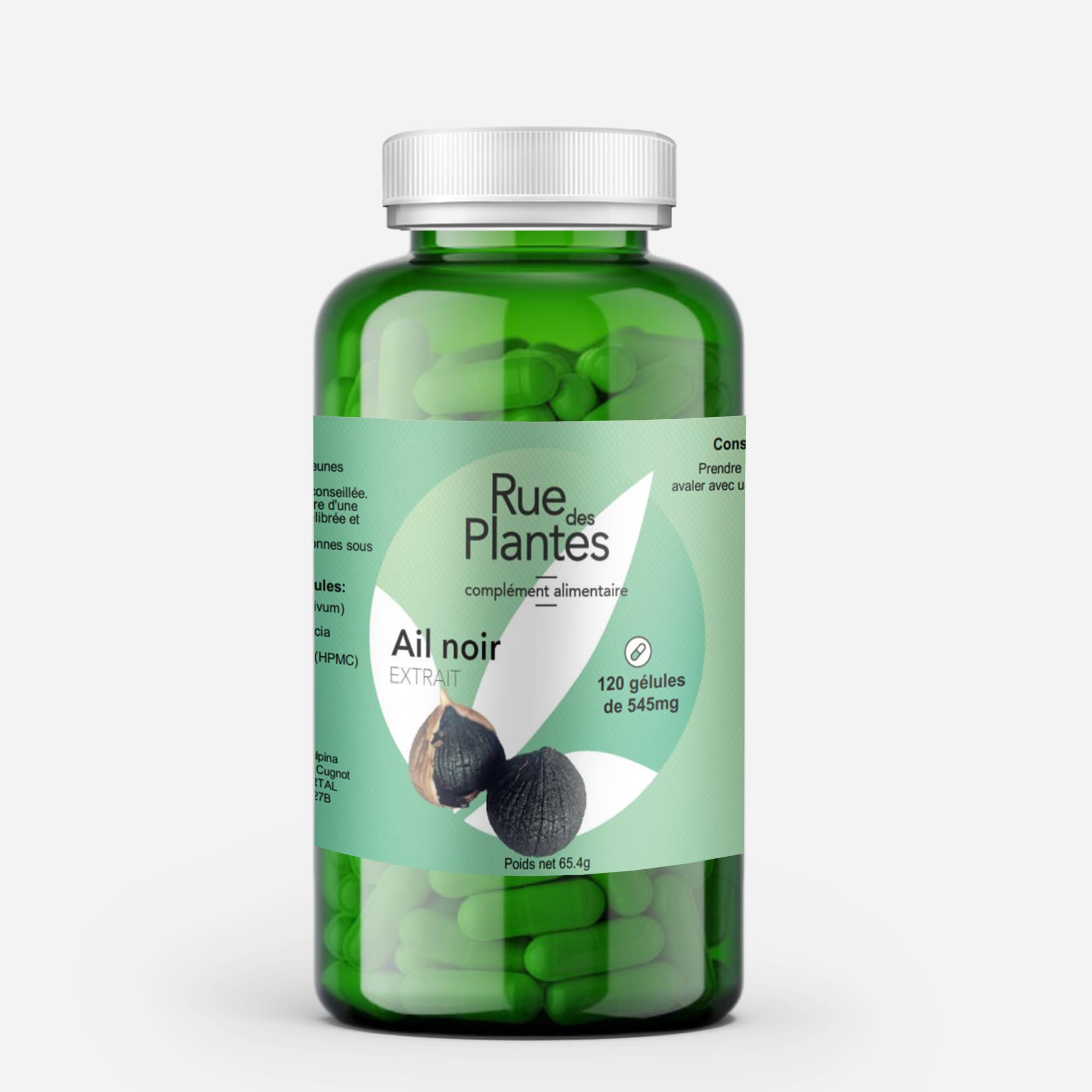 Box of 120 capsules of 545 mg. HPMC (vegetable shell). Dietary supplement formulated exclusively from black garlic.Boite de 120 gélules de 545 mg. HPMC (enveloppe végétale). Complément alimentaire formulé exclusivement à partir d'ail noir.