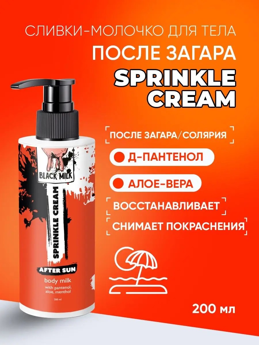 Молочко для тела после загара Sprinkle Cream,200 мл. Увлажняющее молочко для тела с Д-пантенолом обеспечит коже ощущение гладкости бархатистости мягкости и упругости в течении всего дня. Крем для тела восстанавливающий содержит: Д-пантенол который моментально успокаивает увлажняет кожу снимает покраснения и воспаления, Экстракт центеллы азиатской обладает регенерирующим и омолаживающим действием: стимулирует синтез коллагена отлично снимает раздражение делает кожу более упругой борется с свободными радикалами и ослабляет действие УФ-лучей. Комплекс натуральных масел: авокадо макадамии кунжутное - обладает мощным антибактериальным питательным увлажняющим и восстанавливающим свойствами. Это универсальный и эффективный продукт для приятного и действенного ухода за кожей каждый день. Восстанавливающее антивозрастное молочко можно использовать как дневной и ночной уход женский и мужской. Оно подходит девушкам и женщинам с сухой жирной комбинированной возрастной и нормальной кожей. Увлажняющее молочко для тела могут использовать взрослые и подростки. Рекомендуется применять сразу после принятия душа на сухую кожу тела. Косметика для лица и тела BLACK MILK не тестируется на животных. Применение: наносить молочко на тело после душа солярия или прибывания на солнце. Можно использовать вместо крема для рук ног тела.