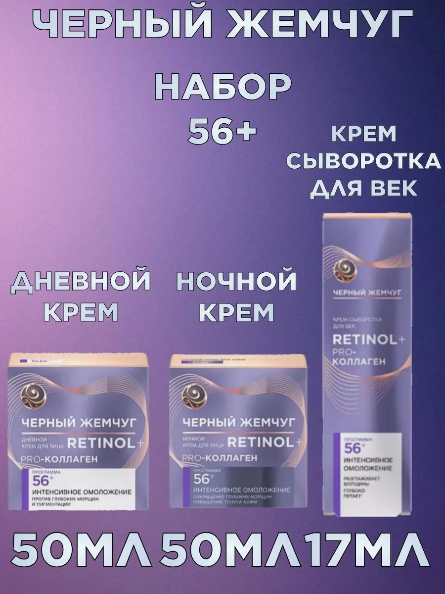 Черный Жемчуг дневной крем для лица Retinol+ PRO-коллаген Программа 56+ направлен на интенсивное омоложение, борьбу с глубокими морщинами и пигментацией. Эффект интенсивного омоложения обусловлен действием активных компонентов крема (масло ши, липосомы с витаминами А, Е и аминокислотами, экстракт водорослей ундария), нацеленных на улучшение метаболизма в коже. Синергетическое действие основной формулы крема и ингредиентов направлено на улучшение упругости, тонуса лица и соответственно омоложения кожи в целом. Тон лица выглядит более ровным благодаря содержанию в составе нитрида бора и оптических микросфер. Ночной крем для лица Retinol+ PRO-коллаген Программа 56+ Интенсивное Омоложение направлен на сокращение глубоких морщин и повышение тонуса кожи. Рекомендован с 56 лет для активного омоложения, направленного на борьбу с морщинами и пигментацией, и интенсивного восполнения утраченного коллагена. Ретинол и PRO-коллаген, усиливая друг друга в формуле, эффективно сокращают глубокие морщины, интенсивно питают кожу и уменьшают пигментацию. Специально подобранная концентрация ретинола способствует осветлению пигментных пятен. Работает на всех уровнях кожи*, борется с глубокими морщинами. Крем-сыворотка для век бренда Черный Жемчуг от 56 лет – это средство, разработанное специально для ухода за нежной кожей вокруг глаз, уменьшения морщин, устранения отечности и мешков под глазами. В отличие от обычных омолаживающих средств, которые насыщают кожу извне, формулы кремов для век Черный Жемчуг линейки Самоомоложение запускают в коже естественные процессы. Получив недостающее питание, клетки начинают правильно функционировать. Кожа восстанавливается естественным путем: активно вырабатывает необходимое количество собственного коллагена, эластина и гиалуроновой кислоты.
