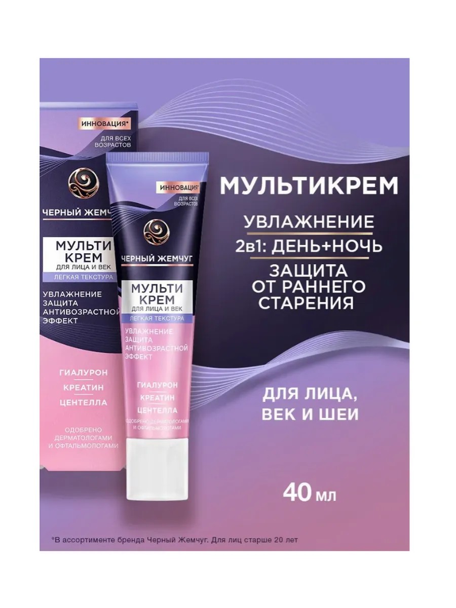 Попробуйте современный адаптивный уход от экспертов бренда Черный Жемчуг – инновационный мультикрем для век и лица. Он создан для качественной комплексной заботы о коже лица и области вокруг глаз. Является отличной базой под макияж. Можно использовать как дневной, так и ночной крем. Подходит для ухода за кожей шеи. Легкая текстура прекрасно наносится и быстро впитывается без ощущения пленки. Преимущества: Антивозрастное и увлажняющее действие благодаря натуральным маслам, эмолентам, увлажнителям и активным компонентам. Повышает защитный механизм клеток кожи и снимает последствия стресса (креатин и компоненты, нацеленные на баланс микробиома). Восстанавливает (ламеллярный эмульгатор, эмоленты, витамин Е). Успокаивает (комплекс 7 азиатских целебных трав). Повышает упругость и разглаживает морщины (липосомы с витаминами А и Е и аминокислотами), действует как антивозрастной крем. Улучшает внешний вид, может быть использован как база под макияж. Выравнивает тон. Тонизирует (влагоудерживающие компоненты, полисахариды). Активные действующие компоненты; Гиалурон интенсивно увлажняет, восстанавливает водный баланс. Креатин обеспечивает защиту кожи и восстановление от преждевременного старения и стресса, вызванного УФ-облучением. Центелла обладает мощными восстанавливающими и успокаивающими свойствами. Укрепляет защитный барьер кожи, эффективен от морщин и улучшает внешний вид кожи. Крем содержит 18 компонентов, направленных на улучшение функционирования кожи и сохранения ее молодости. Благодаря активным ингредиентам в составе крем эффективен как питательный, увлажняющий, успокаивающий, омолаживающий для всех типов кожи, в том числе сухой. Одобрено дерматологами и офтальмологами.
