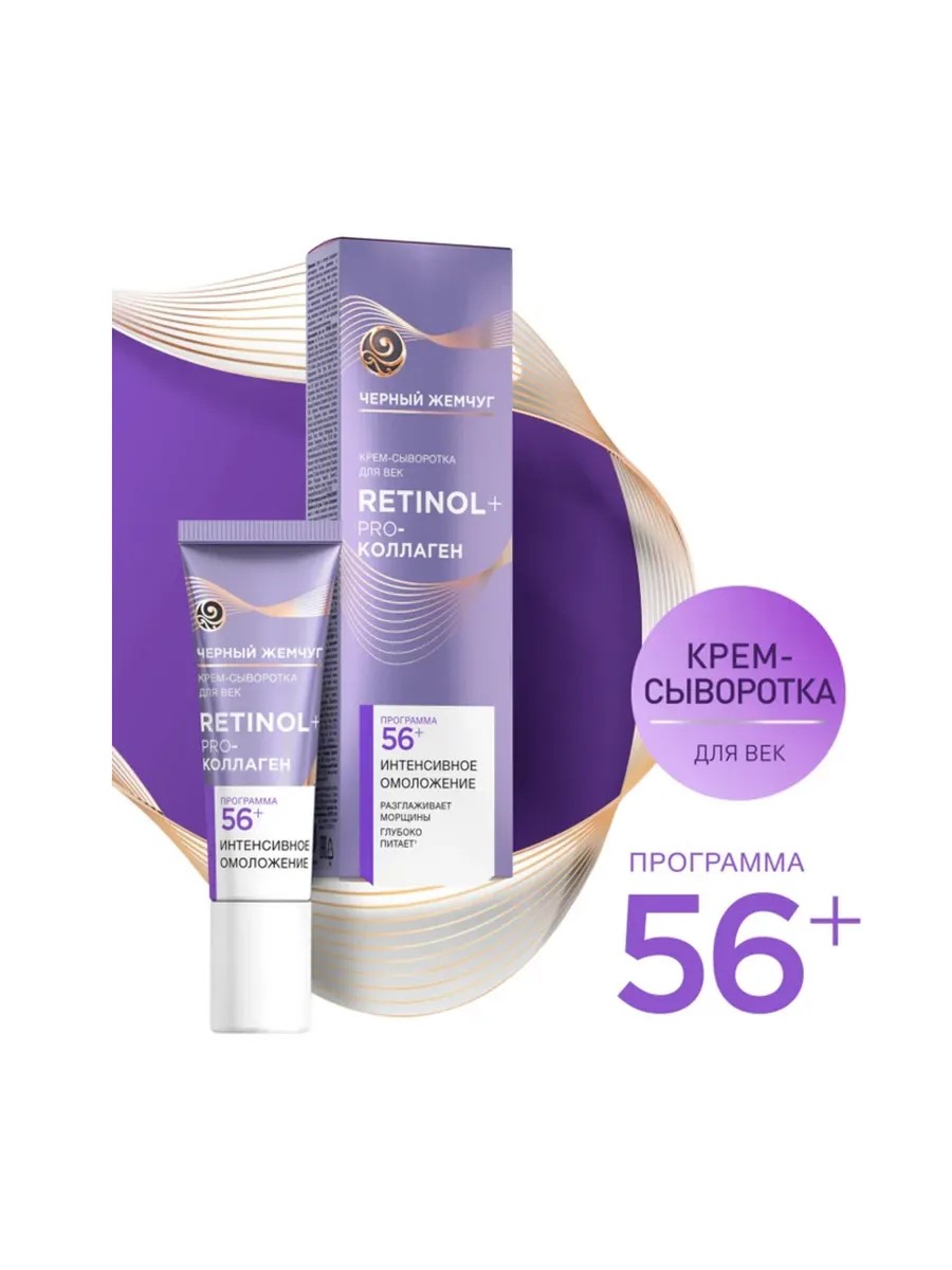 Крем-сыворотка для век Черный Жемчуг Ретинол+ от 56 лет 17мл - эффективное средство для ухода за нежной кожей зоны вокруг глаз. Его состав насыщен активными компонентами, среди которых можно выделить особую липосомальную форму ретинола, которая содержится в строго выверенной концентрации. Также в него входит PRO-коллаген, комплекс аминокислот и антиоксиданты. Благодаря их совместной работе крем-сыворотка обеспечивает интенсивное питание, сокращение пигментных пятен, уменьшение припухлости век и лифтинг-эффект.