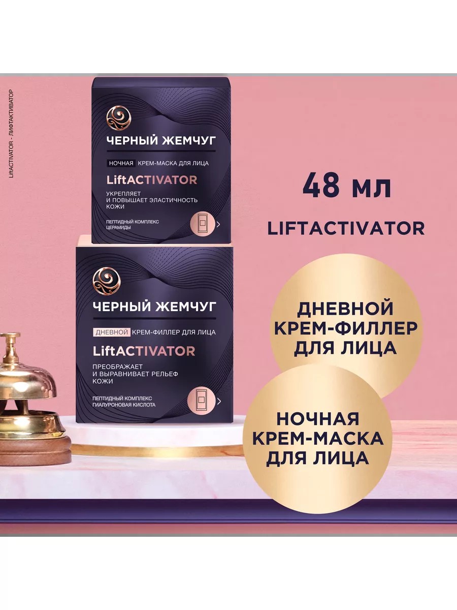 Набор уходовой косметики Черный жемчуг Lift Activator. Комплектация: крем-филлер и ночная крем-маска. Крем создан специально для кожи в возрасте от 35 до 55 лет. Борется с первыми признаками увядания. Активные ингредиенты разглаживают мелкие мимические морщинки. Антивозрастной крем с лифтинг-эффектом предупреждает появление новых морщин. Скульптурирует овал лица, делая его более четким и подтянутым, преображает тон кожи, осветляя избыточную пигментацию, выравнивает рельеф, заметно сокращает несовершенства, повышает упругость и эластичность, освежает и тонизирует. Маска оказывает омолаживающий лифтинг-эффект и возвращает сияние и свежесть. Содержит пептидный комплекс, церамиды, масло макадамии и чиа, экстракт вербены и ундарии. Формула направленно стимулирует выработку собственного коллагена, эластина и гиалурона. Они формируют естественный поддерживающий и уплотняющий каркас эпидермиса. Крем активно восстанавливает кожу в ночное время, укрепляет и повышает эластичность, освежает и тонизирует, дарит сияющий, свежий цвет лица после пробуждения. После применения маски кожа становится более упругой и подтянутой.
