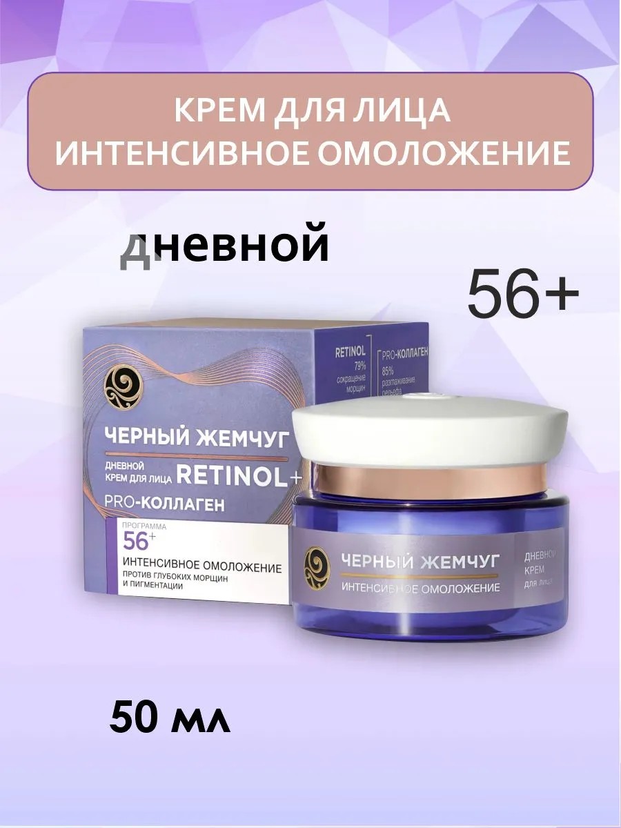 Дневной крем Черный Жемчуг Программа 56+ выводит ежедневный уход за лицом в домашних условиях на новый уровень*. После 56 лет коже нужна усиленная забота и внимание. Ей требуется активное питание, восстановление запасов коллагена, уход, направленный на избавление от морщин и пигментных пятен. Дневной крем активирует синтез коллагена, эластина и гиалуроновой кислоты для восстановления изнутри.