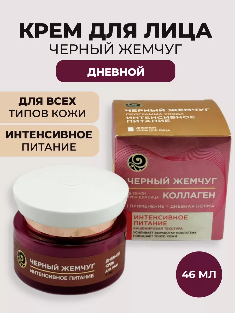 Дневной крем Черный Жемчуг Интенсивное питание создан для борьбы с первыми возрастными изменениями. Средство увлажняет и питает кожу лица, разглаживает мимические морщинки* и подходит в качестве базы под макияж. Крем не оставляет жирного блеска и подходит для всех типов кожи от 25 лет.Питательный крем содержит:дневную дозу коллагена;аллантоин;масла макадамии, авокадо и миндаля;коктейль из полисахаридов;экстракт водорослей.Компоненты, входящие в состав дневного крема Интенсивное питание:усиливают выработку собственного коллагена;повышают тонус кожи;обеспечивают лифтинг-эффект;увлажняют, питают и обновляют кожу;поддерживают целостность кожного барьера;активизируют защитные процессы в клетках кожи.Увлажняющий дневной крем для лица с коллагеном обладает легким ароматом и приятной кашемировой текстурой, быстро впитывается, не оставляя жирного блеска.*Свойства подтверждены тестированием при участии 100 женщин, РФ, 2019.