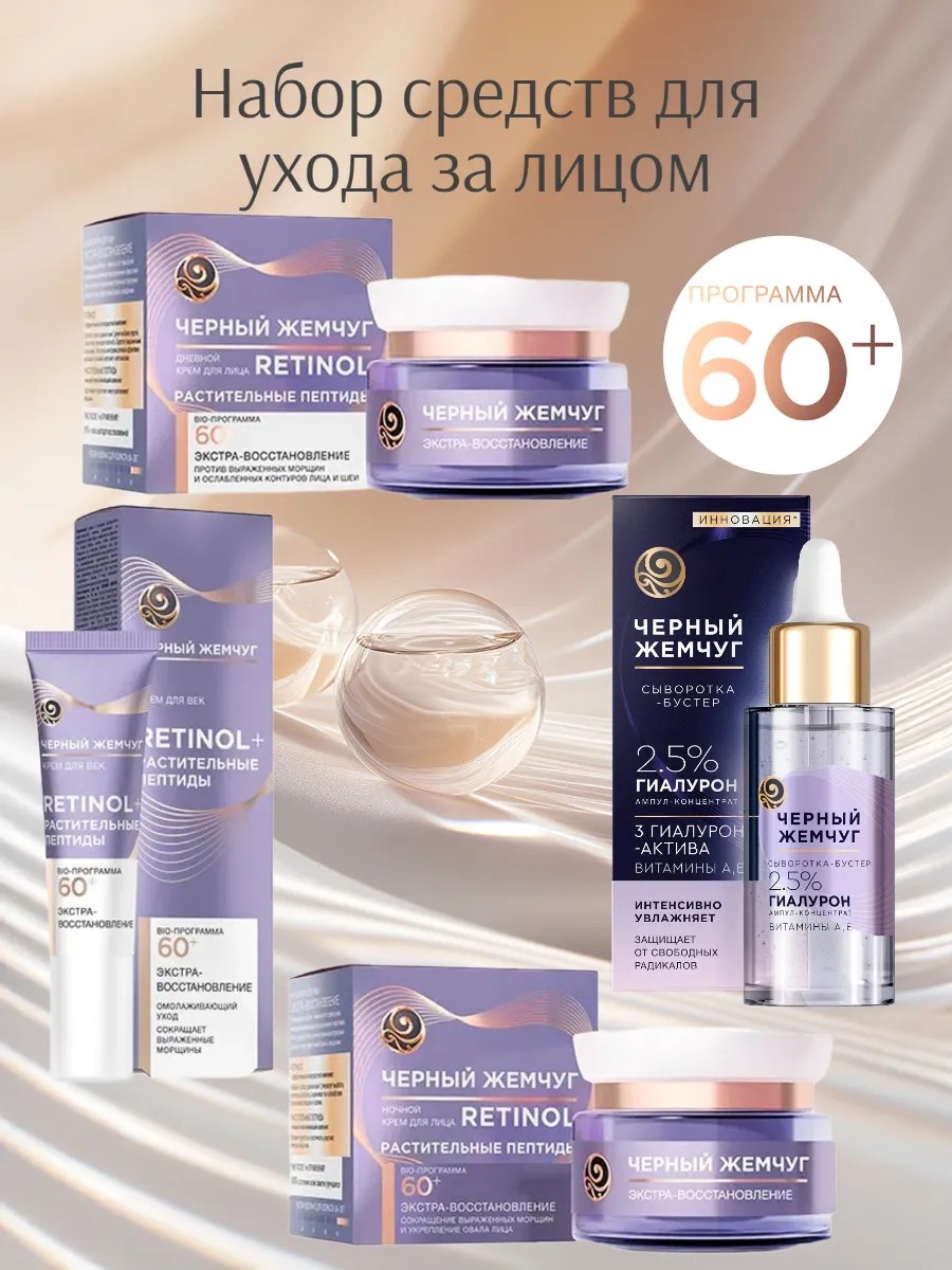 В линейке RETINOL+ Черный Жемчуг есть все средства, которые учитывают потребности кожи в разных возрастах. При регулярном применении они выравнивают тон и микрорельеф, стимулируют выработку собственного коллагена и эластина для поддержания тонуса и упругости кожи. Серия средств для ухода за лицом РАСТИТЕЛЬНЫЕ ПЕПТИДЫ рекомендована с 60 лет, когда коже необходимо усиленное восстановление и укрепление, когда она нуждается в восполнении утраченных структурных компонентов. Продукты с ретинолом и коллагеном помогают активировать интенсивное восполнение утраченного коллагена и питание кожи. Коже после 60 лет свойственны выраженные морщины, нечеткий контур лица и шеи. При регулярном применении подтягивающий дневной крем обеспечивает активный лифтинг-уход, улучшит ее состояние и внешний вид. Ночной крем Экстра - Восстановление помогает выровнять рельеф, повышает упругость, плотность и тонус, активно питает и восстанавливает, разглаживает даже глубокие морщины. Крем для век освежает тон кожи, обеспечивает активное увлажнение и питание, активно восстанавливает кожу, постепенно разглаживает даже глубокие морщины, возвращает естественный тонус и эластичность кожи. Увлажняющая сыворотка-бустер подходит для всех типов кожи (включая чувствительную). Гиалурон-концентрат в сыворотке-бустере обеспечивает быстрое интенсивное увлажнение, сохраняет оптимальный уровень увлажненности кожи на весь день. Увлажняет и разглаживает кожу; делает мимические морщины менее заметными; возвращает эластичность, здоровый тонус и упругость.