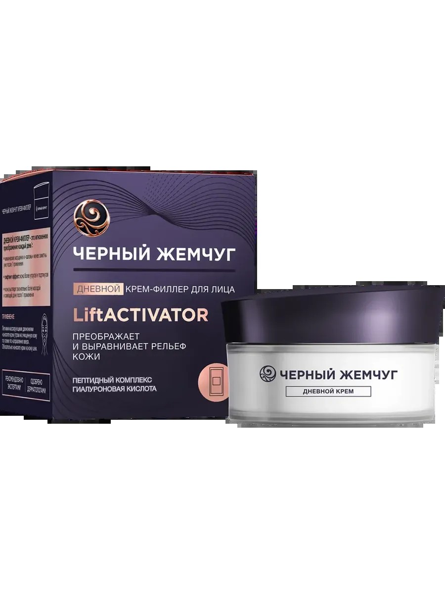 Крем-филлер дневной для лица ЧЕРНЫЙ ЖЕМЧУГ Liftactivator преображает кожу, делает ее более упругой и подтянутой, выравнивает ее рельеф и маскирует мимические морщинки. Пептидный комплекс Liftactivator направленно стимулирует выработку клетками кожи собственных омолаживающих веществ: коллагена, эластина и гиалурона. Они формируют естественный поддерживающий и уплотняющий каркас кожи лица и шеи. Гиалуроновая кислота восполняет водный баланс кожи, способствует выравниванию рельефа. В сочетании с компонентами формулы, поддерживающими выработку собственной гиалуроновой кислоты, она восстанавливает гладкость и упругость, предупреждает появление новых морщин. Результат: мимические морщинки и заломы менее заметны уже после 1 применения, а сама кожа становится более упругой и подтянутой!