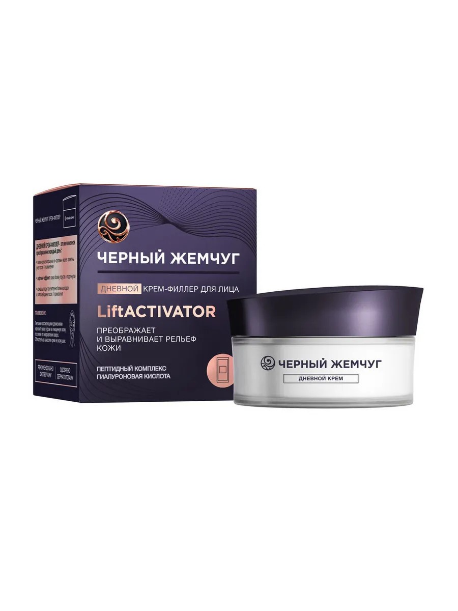 Дневной крем-филлер для лица Черный Жемчуг LiftACTIVATOR - ЛифтАКТИВАТОР создан специально для кожи от 35 лет. Он преображает и выравнивает рельеф кожи и борется с первыми признаками ее увядания. Омолаживающий крем с пептидным комплексом повышает упругость кожи, подтягивает контуры лица и предотвращает появление возрастных пигментных пятен.Лифтинг-крем с пептидным комплексом Черный Жемчуг LiftACTIVATOR - ЛифтАКТИВАТОР содержит:- коллаген;- гиалуроновую кислоту;- пептидный комплекс;- масло макадамии;- экстракты вербены и ундарии.Активные ингредиенты разглаживают мелкие мимические морщинки, укрепляют овал лица и разглаживают заломы. Пептидный комплекс LiftACTIVATOR - ЛифтАКТИВАТОР стимулирует выработку в клетках кожи коллагена, эластина и гиалурона. Крем восполняет водный баланс кожи и способствует выравниванию ее рельефа. Антивозрастный крем с лифтинг-эффектом Черный Жемчуг восстанавливает гладкость и упругость кожи, предупреждает появление новых морщин.Действие дневного разглаживающего крема Черный Жемчуг LiftACTIVATOR - ЛифтАКТИВАТОР 35+:- скульптурирует овал лица, делая его более четким и подтянутым;- преображает тон кожи, осветляя избыточную пигментацию;- выравнивает рельеф кожи;- заметно сокращает даже глубокие морщины;- повышает упругость и эластичность кожи лица;- освежает и тонизирует кожу.Дневной крем-филлер — это мгновенное преображение* каждый день: мимические морщинки и заломы менее заметны уже после 1 применения, а сама кожа становится более упругой и подтянутой! Эффективность пептидного филлер-крема доказана потребительским тестированием.*Свойства подтверждены потребительским тестированием при участии 100 женщин, min 74% согласившихся, РФ, 2020, а также клиническими исследованиями при участии 30 женщин в возрасте от 35 до 55 лет, РФ, 2020-2021.