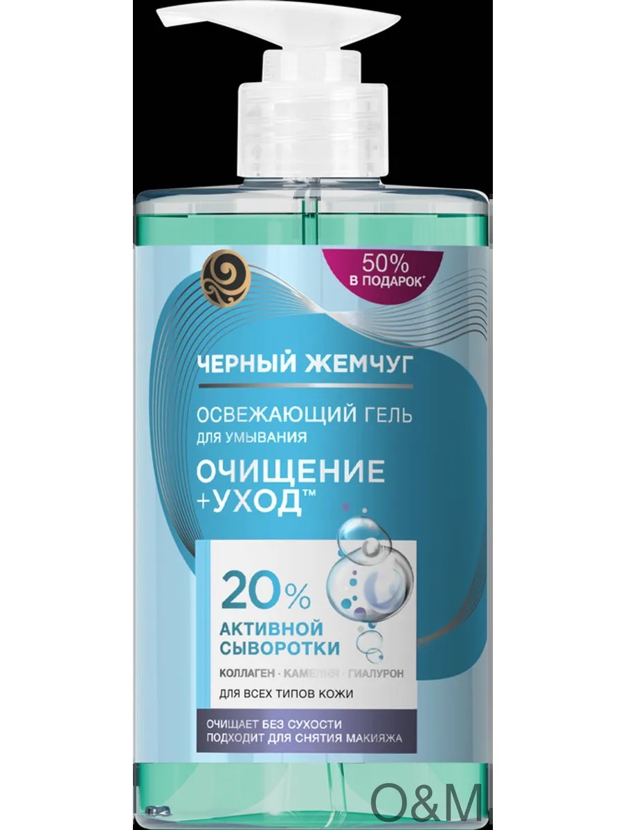 Гель для умывания ЧЕРНЫЙ ЖЕМЧУГ Очищение+уход освежающий, для всех типов кожи, представлен в большом объеме. В его составе 20% активной сыворотки, которая увлажняет, питает и повышает упругость кожи во время очищения. Сыворотка с коллагеном, гиалуроном и маслом семян камелии продолжает действовать даже после смывания.