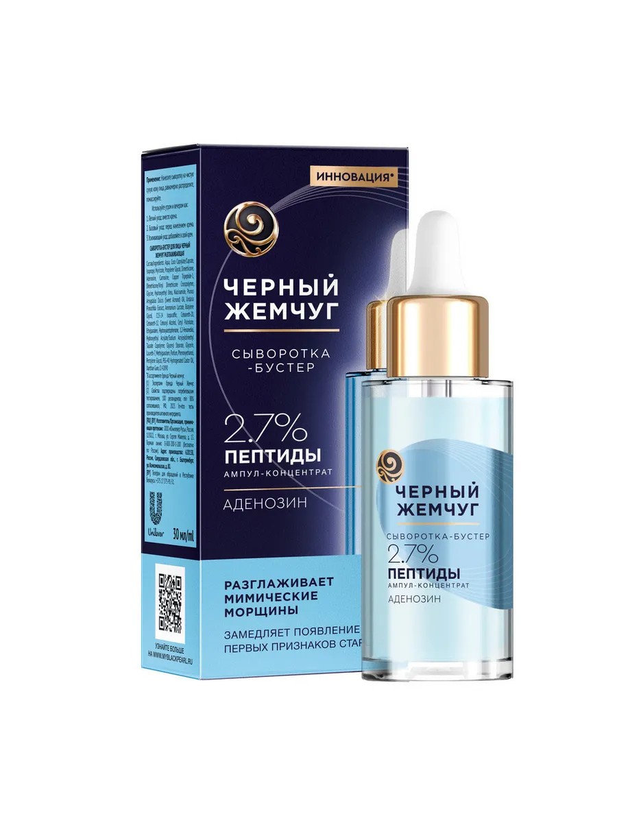 Инновационная*разглаживающая сыворотка-бустер разработана экспертами бренда Черный Жемчуг совместно с косметик-эстетистами для ежедневного комплексного ухода за кожей лица. Средство подходит для женщин и мужчин с разными типами кожи, включая чувствительную. Преимущества:• Заметно разглаживает мимические морщины;• Предотвращает возникновение новых заломов;• Повышает тургор и плотность кожи, оказывая лифтинг-эффект;• Способствует защите кожи от негативного воздействия синего света экранов';• Защищает от окислительного стресса и улучшает метаболизм клеток кожи;• Замедляет процессы старения;• Мгновенно впитывается без ощущения липкости.Активные действующие компоненты:Пептиды ампул-концентрат в высокой концентрации 2,7% эффективно восстанавливает упругость кожи;Аденозин оказывает антиоксидантное воздействие.Почувствуйте усиленный эффект при использовании программы ухода: 1. Выравнивающая пилинг-скатка для лица.2. Крем-эксперт для век.3. Крем для лица 25+ SPF 30.Свойства разглаживающей сыворотки-бустера подтверждены в ходе потребительского тестирования**. Так, 94% респондентов отметили, что сыворотка заметно повышает плотность, придает ровный тон и сияние, визуально делает кожу более подтянутой; 90% – заметно выравнивает рельеф кожи; 88% – разглаживает мимические морщины; 91% – визуально подтягивает контур лица; 98% – освежает кожу.Используйте утром и вечером как три средства! Как легкий уход – вместо крема; как базовый уход – перед нанесением крема; как усиливающий уход – просто добавьте в свой крем. Одобрено дерматологами.Серия продуктов Черный Жемчуг Resort разработана для эффективных преображений, удовольствия ухода за собой и качественного результата. Подарите своей коже полноценное восстановление и уход.