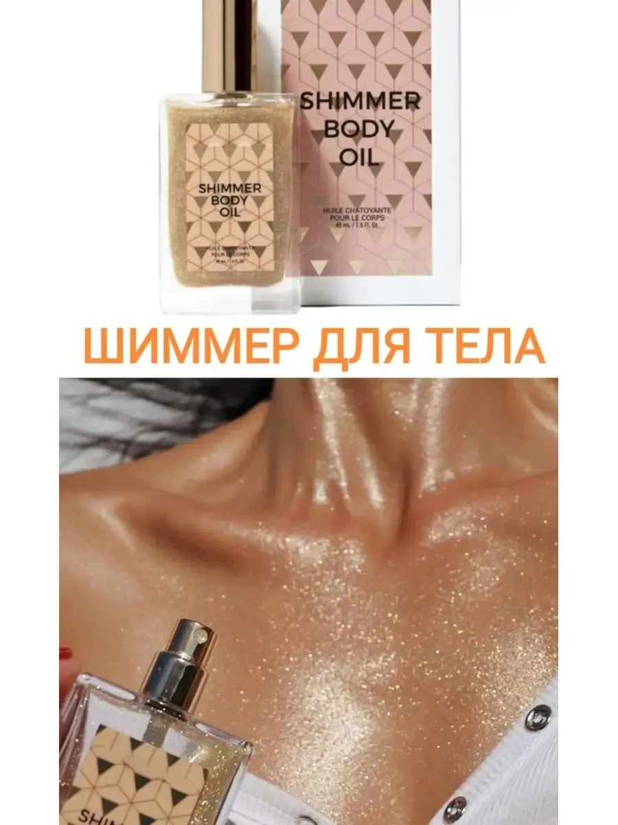 Масло для тела с шиммером новое мерцающее масло для тела Shimmer Body Oil. Богатое и роскошное, мерцающее масло для тела оставляет кожу с осязаемым, шелковисто-мягким ощущением и солнечным сиянием. Это роскошное легкое мерцающее масло, придающее коже солнечное сияние. Сверкающие частицы в глиттере ложатся на кожу вуалью и дарят деликатное мерцание. Это сухое масло, оно не будет оставлять жирность на коже. У новинки стеклянный флакон с распылителем. Хайлайтер подходит для светлой кожи, а также подчеркивает загар. Средство очень комфортно в применении, оно увлажняет и питает кожу, так как имеет маслянистую текстуру. У шиммера шикарный ванильно-кокосовый аромат, который не оставит равнодушным ни одну обладательницу данного масла. Перед применением необходимо обязательно хорошо встряхнуть флакон для равномерного распределения блёсток.