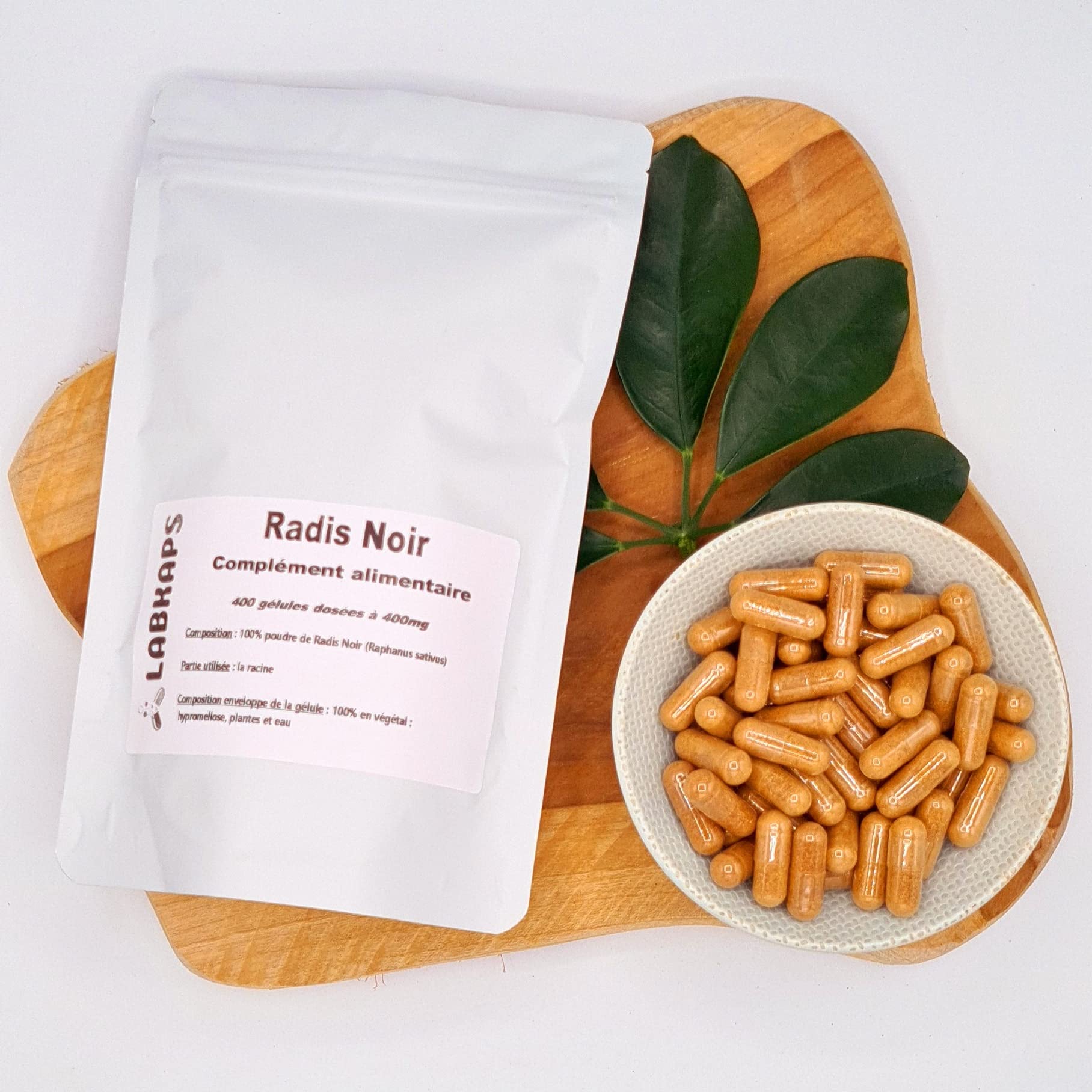 The Black Radish is a biennial plant with an oversized taproot: a variety whose fleshy root is covered with a rough, black, sometimes purplish skin and white, firm and juicy flesh. This black carrot has a dense rosette of very jagged and slightly hairy leaves. This rosette of leaves can grow from 30 cm to 60 cm in height depending on the varieties and growing conditions. It eventually develops a tall, highly branched flower stem using the reserves of the root. This is why the root of the black radish must be removed before flowering. The flowers are white with 4 petals. Directions for use: 2 to 4 capsules day to swallow with a large glass of water to supplement a varied and balanced diet. Do not exceed the recommended daily dose. Do not leave within reach of young children. Store away from light, heat and humidity. As with any nutritional supplement, consult a healthcare professional before consuming it. Not recommended for children, pregnant or breastfeeding women. For 4 capsules: 1600 mg of Black Radish INGREDIENTS 100 black radish powder100 plant-based. 100 NATURAL: All ingredients are of natural origin, gluten-free, fructose-free, lactose-free, and GMO-free. VEGAN product. FRENCH QUALITY: We manufacture our food supplements in France. Our goal is to guarantee you the best quality price ratio. We check each batch for the presence of pesticides, bacteria, and heavy metals to offer you a product of impeccable quality at a low price. Le Radis Noir est une plante bisannuelle avec une racine pivotante surdimensionnée : une variété dont la racine charnue est recouverte d'une peau rugueuse et noire, parfois violacée et à la chair blanche, ferme et juteuse. Cette carotte noire porte une rosette dense de feuilles très découpées et un peu velues. Cette rosette de feuilles peut grandir de 30 cm à 60 cm de hauteur en fonction des variétés et des conditions de culture. Elle finit par développer une haute tige florale très ramifiées en utilisant les réserves de la racine. C'est pourquoi la racine du radis noir doit être prélevée avant la mise en fleur. Les fleurs sont blanches à 4 pétales. Conseil d'utilisation : 2 à 4 gélules jour à avaler avec un grand verre d'eau à prendre en supplémentation d'une alimentation variée et équilibrée. Ne pas dépasser la dose quotidienne recommandée. Ne pas laisser à la portée des jeunes enfants. Conserver à l'abri de la lumière, de la chaleur et de l'humidité. Comme avec tout supplément nutritionnel, consultez un professionnel de santé avant de le consommer. Déconseillé chez les enfants, femmes enceintes ou allaitantes. Pour 4 gélules : 1600 mg de Radis Noir INGRÉDIENTS 100 poudre de radis noir100 d'origine végétale. 100 NATUREL : Tous les ingrédients sont d'origine naturelle, sans gluten, sans fructose, sans lactose et sans OGM. Produit VEGAN. QUALITÉ FRANÇAISE : Nous fabriquons nos compléments alimentaires en France. Notre volonté est de vous garantir le meilleur rapport qualité prix. Nous contrôlons pour chaque lot la présence de pesticides, de bactéries, de métaux lourds pour vous offrir un produit d'une qualité irréprochable à petit prix.