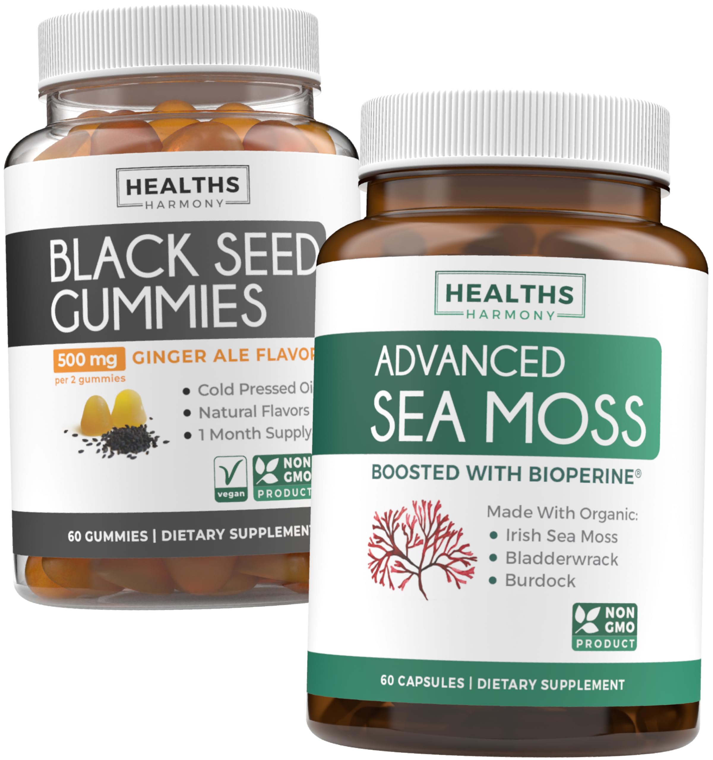 Start your journey to better health with the powerful synergy of Black Seed Oil and Sea Moss!. Advanced Formula: Our potent Sea Moss blend includes three types of nutrient-rich organic Sea Moss, supporting overall well-being by combining the benefits of Irish Moss, Burdock Root, and Bladderwrack in one capsule. Fortified with Black Pepper extract to enhance nutrient absorption, experience the maximum benefits of this natural superfood in a convenient and easy-to-use form. Cold-pressed black seed oil gummies: We source the wonderful plant nigella sativa from its natural home, capture it all in a 250mg gummy along with only natural flavorings and manufacture it right here in the USA. The result is a superior-quality black cumin seed oil gummy that carries all the benefits in a convenient and delicious form. Mineral-Rich Duo: Combining Black Seed Oil with Sea Moss, this bundle supports your daily wellness with a nutrient-dense blend.