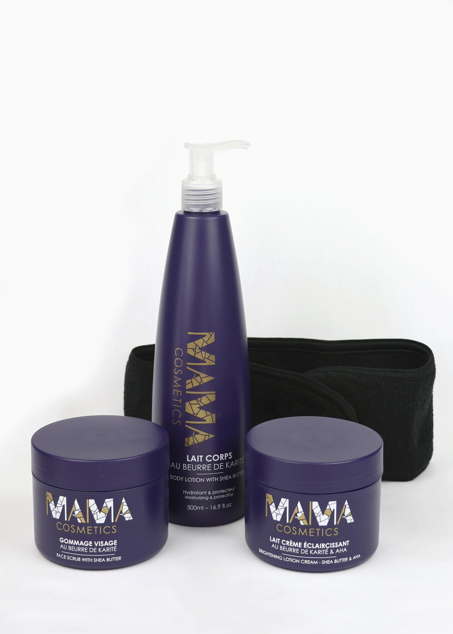 DESCRIPTION This set contains the body milk, the facial scrub, the lightening cream milk and a headband. Body milk Dedicated to dry skin lacking hydration, MAMA COSMETICS SHEA BUTTER BODY MILK protects the skin from external aggressions (pollution, stress, limescale, etc.). Enriched with Shea butter, produced in Burkina Faso, its comfortable formula hydrates and prevents dehydration for supple and soft skin from the first application. Its soft and light texture with delicious notes nourishes and soothes without sticking for a guaranteed moment of relaxation. The effect of the moisturizer will highlight your skin by giving it a natural shine! Benefits: PROTECTS the skin from external aggressions. HYDRATES PREVENTS dehydration. NOURISHES SOOTHES without a greasy finish. The facial scrub Dedicated to dry skin, the Mama Cosmetics facial scrub eliminates impurities and dead cells instantly. Enriched with Shea nut powder, its creamy texture gently exfoliates, boosts the penetration of following treatments and restores radiance to the skin. Combined with shea butter, its 96 natural origin formula nourishes, maintains natural hydration and prevents skin dryness. Delicately scented, it unifies, softens and soothes for a healthy-looking complexion. Benefits: EXFOLIATES without attacking. ENHANCES the complexion. SOFTENES EVENIFIES skin texture. Lightening milk cream Enriched with AHA and shea butter, Mama Cosmetics' lightening milk cream hydrates, nourishes and softens the skin's texture. Its lightening formula with a soft and subtle fragrance enhances the complexion for radiant and even skin from the first application. It shinesCOMPLETE SET: This set includes the body lotion, facial scrub, lightening cream milk, and a headband for a complete skincare routine. ENRICHED WITH SHEA BUTTER: Each product is formulated with shea butter from Burkina Faso to nourish and soothe the skin. UNIFIES AND ENHANCES: The lightening cream milk hydrates and evens out the complexion, providing brighter, more even skin tone from the first application. PROTECTS AND HYDRATES: The body lotion hydrates and protects the skin from external aggressors while providing immediate softness. PROTECTS AND HYDRATES: The body lotion hydrates and protects the skin from external aggressors while providing immediate softness. DESCRIPTION Ce lot contient le lait pour le corps, le gommage visage, le lait crème éclaircissante et un bandeau. Le lait pour le corps Dédié aux peaux sèches et en manque d'hydratation, le LAIT CORPS AU BEURRE DE KARITE de MAMA COSMETICS protège la peau des agressions extérieures (pollution, stress, calcaire, etc). Enrichie en beurre de Karité, produit au Burkina Faso, sa formule confortable hydrate et prévient la déshydratation pour une peau souple et douce dès la 1ère application. Sa texture douce et légère aux notes gourmandes nourrit et apaise sans coller pour un moment de détente assuré. L'effet de la crème hydratante mettra en avant votre peau en lui donnant une brillance naturelle ! Bénéfices : PROTEGE la peau des agressions extérieures. HYDRATE PREVIENT la déshydratation. NOURRIT APAISE sans fini gras. Le gommage visage Dédié aux peaux sèches, le gommage visage de Mama Cosmetics élimine impuretés et cellules mortes instantanément. Enrichie en poudre de noix de Karité, sa texture onctueuse exfolie en douceur, booste la pénétration des soins suivants et redonne de l'éclat à la peau. Combinée au beurre de karité, sa formule à 96 d'origine naturelle nourrit, maintient l'hydratation naturelle et prévient le dessèchement cutané. Délicatement parfumée, elle unifie, assouplit et apaise pour un teint éclatant de santé. Bénéfices : EXFOLIE sans agresser. SUBLIME le teint. ADOUCIT UNIFIE le grain de peau. Le lait crème éclaircissant Enrichi en AHA et beurre de karité, le lait crème éclaircissant de Mama Cosmetics hydrate, nourrit et assouplit le grain de peau. Sa formule éclaircissante au parfum doux et subtil sublime le teint pour une peau éclatante et unifiée dès la 1ère application. Il éclaiLOT COMPLET : Ce lot comprend le lait pour le corps, le gommage visage, le lait crème éclaircissant et un bandeau pour une routine de soin complète. ENRICHIS EN BEURRE DE KARITÉ : Chaque produit est formulé avec du beurre de karité du Burkina Faso pour nourrir et apaiser la peau. UNIFIE ET SUBLIME : Le lait crème éclaircissant hydrate et unifie le teint, offrant une peau plus lumineuse et uniforme dès la première application. PROTÈGE ET HYDRATE : Le lait pour le corps hydrate et protège la peau des agressions extérieures tout en offrant une douceur immédiate. PROTÈGE ET HYDRATE : Le lait pour le corps hydrate et protège la peau des agressions extérieures tout en offrant une douceur immédiate.