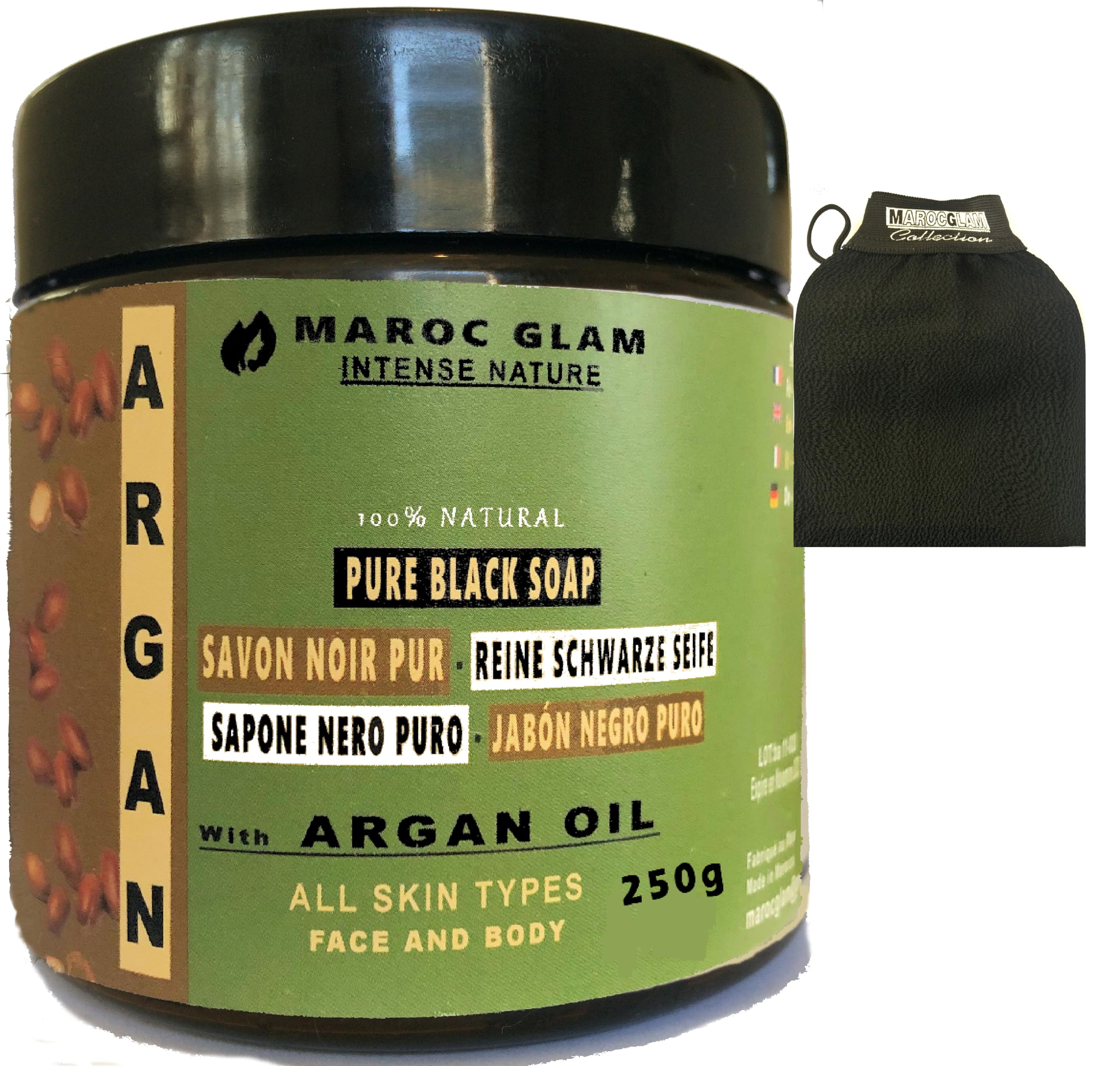 Genuine scrub with raw Moroccan black soap from the Hammam 100 Natural with basic PH (around 10.5) with olive oil enriched with organic Argan oil, Compact and of very good quality, prepared with olive oil and crushed olives and Argan. Guarantees INTENSE HYDRATION of the skin thanks to the oleic acid in the oil, Slows down skin aging thanks to the antioxidant power of vitamin E. Our MAROC GLAM brand takes care to select products from artisanal manufacturing in structured agricultural cooperatives promoting entirely natural products and respecting an ancestral manufacturing method, 250 grams DIRECTIONS FOR USE Apply the product to wet skin, massage gently, then rinse thoroughly. SAFETY WARNING Avoid contact with eyes, in case of contact rinse thoroughly with water and contact your doctor ✓ RICH IN VITAMIN E AND ANTIOXIDANTS: Argan oil is extracted from the argan tree, a tree endemic to the Berber region of Morocco for thousands of years, bringing to the skin a softness that is still unmatched today. Known for its virtues against eczema as well as skin dehydration, your skin will regain clarity, shine, delicacy, finesse. ✓ Guarantees skin that is soft and satiny to the touch after the Hammam ritual. ✓ FIND AND KEEP YOUNG SKIN: Vitamin E now appears to be a particularly beneficial micro-nutrient. Slowing down the process of cellular aging, it will allow you to keep healthy skin at all times because the skin will be constantly nourished with everything it needs and thus delay the appearance of wrinkles. ✓ PURE BLACK SOAP CONTINUOUSLY AND DEEPLY NOURISHES THE SKIN: Still thanks to vitamin E but also to linic and oleic acids, it softens the skin, whatever the type you have, eliminates dead skin, purifies the epidermis and helps cell regeneration thanks to these virtues renowned worldwide and known to all. ✓ 100 ORGANIC ARGAN OIL FROM AGRICULTURAL COOPERATIVES AND combined with Moroccan black olive oil from the high Atlas Mountains, cold pressed to extract the purest oil by harvesting ONLY the "First Pressing", added to this crushed olives, salt and vegetable potash as per pure ancestral Moroccan tradition. HAMMAM BLACK SOAP Gentle scrub, exfoliates, purifies and nourishes deeply. Véritable gommage au savon noir marocain brut du Hammam 100 Naturel au PH basique ( environ 10,5) à l'huile d'olive enrichi à l'huile d'Argan Bio, Compact et de très bonne qualité, préparé à base d'huile d'olive et d'olives broyés et d'Argan. Garantit une HYDRATATION INTENSE de la peau grâce à l'acide oléique de l'huile, Ralentit le vieillissement cutané grâce au pouvoir antioxydant de la vitamine E. Notre marque MAROC GLAM prend soin de vous sélectionner des produits issus de fabrication artisanale dans des coopératives agricoles structurées valorisant des produits intégralement naturels et respectant une méthode de fabrication ancestrale, 250 grammes MODE D'EMPLOI Appliquer le produit sur la peau humide, masser doucement, puis rincer abondamment. AVERTISSEMENT DE SÛRETÉ Eviter tout contact avec les yeux, en cas de contact rincer abandemment à l'eau et contacter votre medecin ✓ RICHE EN VITAMINE E ET EN ANTIOXYDANTS : L'huile d'argan est tirée de l'arganier, arbre endémique de la région berbère du Maroc depuis des millénaires, apporte à la peau une douceur jusqu'aujourd'hui inégalée. Réputé pour avoir des vertus contre l'eczéma ainsi que la déshydratation cutanée, votre peau retrouvera, clarté, brillance, délicatesse, finesse . ✓Garantit une peau douce et satinée au toucher après le rituel Hammam. ✓ RETROUVER ET GARDER UNE PEAU JEUNE : La vitamine E apparaît désormais comme un micro-nutriment particulièrement bénéfique. Ralenti le processus du vieillissement cellulaire, elle vous permettra de garder une peau saine à tout moment car la peau sera constamment nourri de tout ce dont elle a besoin et retardera ainsi l'apparition des rides . ✓ LE SAVON NOIR PUR PERMET DE NOURRIR LA PEAU EN CONTINU ET EN PROFONDEUR : Toujours grâce à la vitamine E mais aussi aux acides linéiques et oléiques, il permet d'adoucir la peau, quelque soit le type que vous avez, élimine les peaux mortes, purifie l'épiderme et aide à la régénération cellulaire grâce à ces vertus réputées mondialement et connus de tous . ✓ L'HUILE D'ARGAN 100 BIO ISSUS DE COOPERATIVE AGRICOLES ET associée à l'huile d'olives noir Marocaines provenant des hautes montagnes de l'Atlas, pressées à froid afin d'en extraire l'huile la plus pur en récoltant UNIQUEMENT la « Première Pression « , ajouté à cela des olives pilés, du sel et une potasse végétale comme le veut la pure tradition ancestrale Marocaine . SAVON NOIR HAMMAM Gommage doux, exfolie, purifie et nourrit en profondeur.