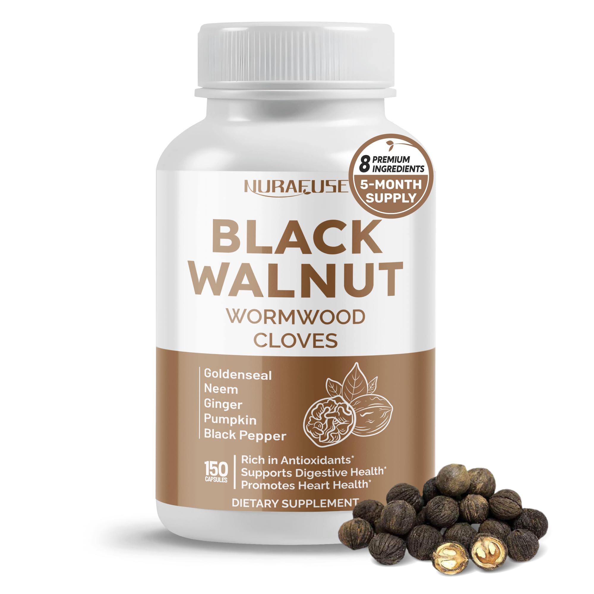Rest Assured: Nurafuse prioritizes health with the highest-quality, responsibly sourced ingredients, and adheres to GMP standards. Each product is crafted with care, ensuring effective, reliable supplements for your vitality and well-being. High Standards: Nurafuse ensures trust and purity through rigorous testing of every ingredient in ISO 17025-accredited labs. All ingredients are 100 natural, non-GMO, gluten-free, and chemical-free. Source of Essential Nutrients: Black walnut is a natural source of nutrients, including omega-3 fatty acids, magnesium, and manganese, which are important for heart wellness, cognitive function, and bone strength. Formulated with Premium Ingredients: Nurafuse Black Walnut combines wormwood, whole cloves, and other potent ingredients in optimal concentrations to provide a rich source of antioxidants and support your digestive health. Five Months' Worth: Providing 150 capsules in each bottle, NuraFuse Black Walnut Supplement ensures a convenient five-month supply, requiring just one daily capsule for easy incorporation into your daily routine.