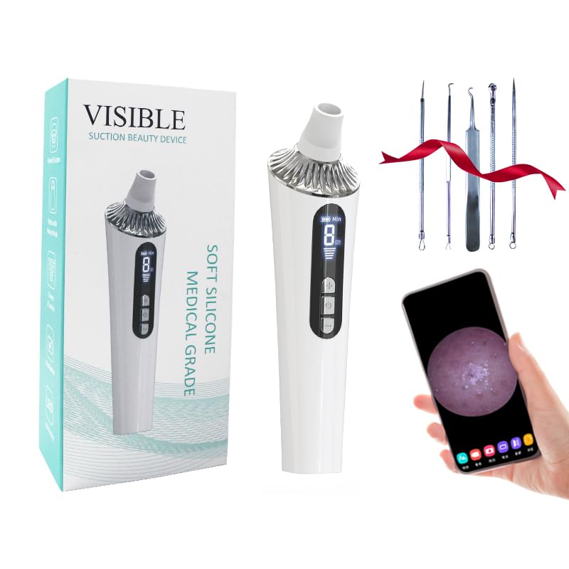 Tips: Use a hot towel to open pores before use. In addition, apply facial mask or skin care products after use to shrink pores Precautions: 1) Move quickly, don't pass by the same place too often, and avoid over-cleaning. 2) If you have sensitive skin, it is recommended to start with the low setting to find your suitable suction level. 3) Choose appropriate nozzles for different areas. 4) Use a blackhead tool as a supplement to your cleanser.WIFI LONG STANDBY TIME: The Pore Vacuum with Camera connect your phone via WIFI. Applicable to Android4.4, iOS10.0, Mac OS 11.0 and above. Built-in USB rechargeable battery. If 5mins per time and 1-2 times per week, it can use it for half month after charge fully. WHAT YOU'LL GET: Blackhead remover x 1, replaceable head x 4, stainless steel pimple popper blackhead remover tools x 4, USB charging cable x 1, product manual x 1. ENJOY PROFESSIONAL SKIN CARE: Powerful Blackhead Remover for face can be safely used directly achieving deep cleaning and effectively removing blackheads, whiteheads, and dead skin, grease. Help you recover from common facial skin problems. HD CAMERA LED display: Compare with the traditional pore cleaner device, Our Blackhead Remover Vacuum is built a 1080P HD lens. You can see the real skin image of your pores enlarge to 20 times. you can check the suction level on the LED display. ADJUSTABLE SUCTION 4 PROBES: The Blackhead Remover with camera support 5 kinds of suction and 4 replacement probes. Different strength suction are aimed at different skin and area, such as: Level 1 is suitable for sensitive and dry skin, level 2-3 are suitable for neutral skin, level 4-5 are designed for mixed and oily skin.
