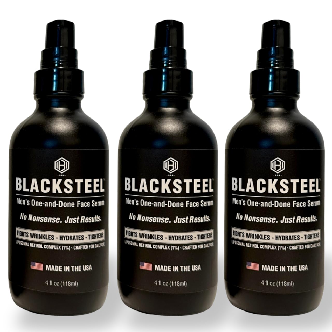 This 3-Pack includes the same BLACKSTEEL men's anti-aging face serum trusted by customers for daily wrinkle repair, deep hydration, and firmer-looking skin. The formula is identical to our single bottle and 2-Pack — no changes, no reformulation — just more supply for consistent use. Designed as a 4–6 month supply, this bundle is ideal for men who already know BLACKSTEEL works and want to stay stocked without reordering. One clean, high-performance serum replaces moisturizer, anti-aging cream, and aftershave in a single step, delivering visible results without a complicated routine. Crafted in small batches in the USA and bottled in durable matte black glass, BLACKSTEEL is built for performance, not hype.