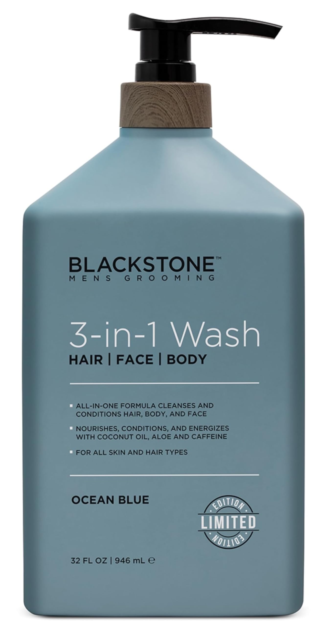 Paraben Free, Cruelty Free, Made in USA. NOURISHING FORMULA: This nourishing formula provides a rich lather that eliminates dirt and impurities without stripping skin and hair of essential moisture. MAINTAIN OVERALL HEALTH OF SKIN AND HAIR: This multi-purpose wash is formulated with Coconut oil, Aloe and Caffeine to maintain overall health of skin and hair for all hair and skin types. ONE EASY STEP: Simplify your routine with the ultimate all-purpose wash designed for your hair, face and body. Washes away dirt And sweat in one easy step without over-drying. BLACKSTONE MEN'S GROOMING 3-IN-1 HAIR, FACE, AND BODY WASH: Energizing hair, face and body cleanser formulated for men. Ocean Blue, 32 Fl Oz.