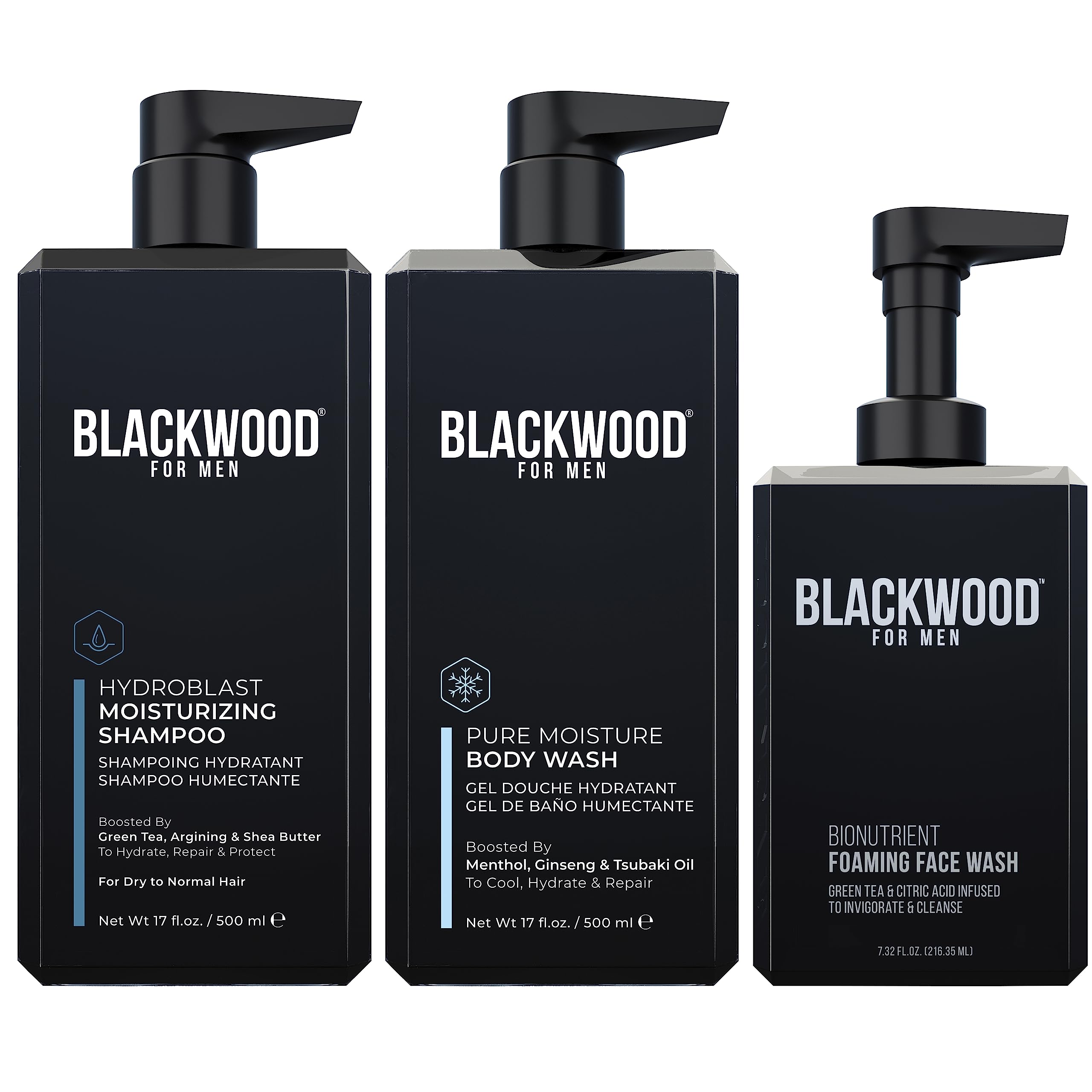 Blackwood For Men Hydroblast Moisturizing Shampoo (17oz) Pure Moisture Body Wash (17oz) and BioNutruent Foaming Face Wash (4.45oz) Bundle for Men