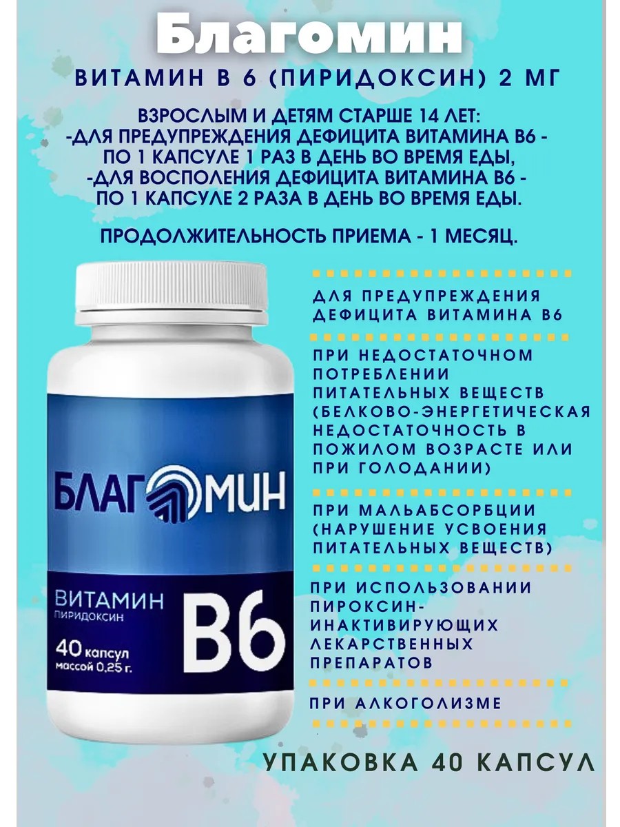 БЛАГОМИН Витамин В6 (пиридоксин) 2 мг 40 капсул*1уп