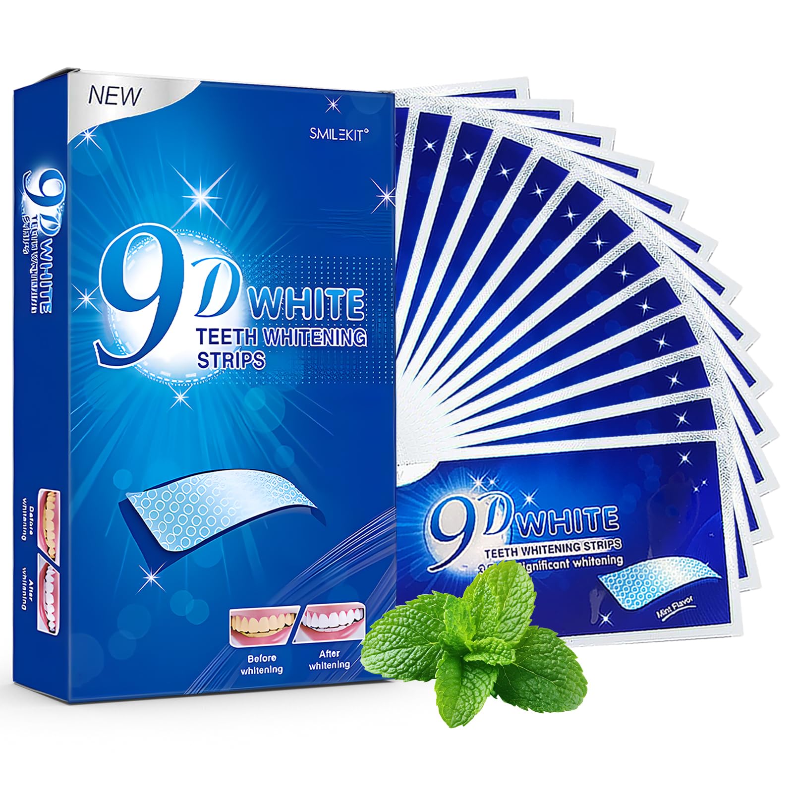 avecemballagebleu,composéde14pairesdebandelettes.L'imagemontreuneboîtedeproduitsetunefemmesourianteauxdentsblanchesetbrillantes.