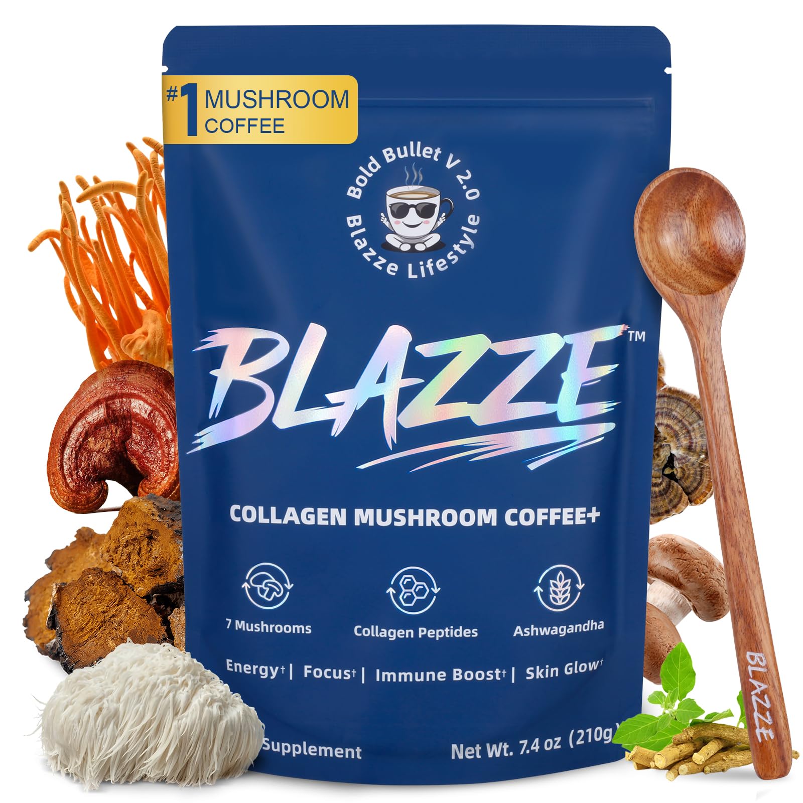 THE BLAZZE STANDARD — because your health isn't a guessing game. You've got enough to think about wondering what's really in your coffee shouldn't be one of them. That's why our Reishi is sourced from organically certified farms in four countries, and all of our functional mushrooms are produced in ISO-, HACCP- and cGMP-certified facilities. Each batch is third-party tested to help ensure it's clean and in line with quality standards in the U.S. and abroad. Our goal is simple: you enjoy a creamy, collagen-infused cup and feel good about what you're drinking. If it ever doesn't feel right for you—for any reason—message us directly, no return needed, and we'll work to make it righ. CREAMY TEXTURE EASY MIXING: We have solved the common taste issues of functional powders. The inclusion of Coconut Milk Powder creates a naturally smooth, creamy latte texture that masks earthy notes. Simply mix into hot water or pour over ice for a delicious, convenient beverage that fits seamlessly into Keto and Paleo lifestyles. BALANCE METABOLISM: Fortified with Ashwagandha to support the body's natural response to stress, our blend helps maintain a calm equilibrium. The addition of MCT Oil and Coconut Milk Powder provides healthy fats that support metabolic function and ketosis. This unique combination makes it a perfect morning fuel that nourishes both your mind and body. 7-MUSHROOM FRUITING BODY COMPLEX: Each serving is powered by top-tier focus coffee mushrooms—specifically Lion's Mane and Cordyceps—synergized with immune-supporting Chaga, Reishi, Turkey Tail, Maitake, and Shiitake. We utilize a potent 10:1 extract ratio derived strictly from 100 fruiting bodies (no mycelium fillers) to ensure you get the maximum functional benefit in every cup. COLLAGEN PEPTIDES FOR SKIN JOINTS: While many generic mushrooms coffee brands focus solely on energy, Blazze goes further by including hydrolyzed Bovine Collagen Peptides. Regular consumption assists in maintaining healthy skin elasticity, hair, nails, and joint mobility. It's the ultimate 2-in-1 biohack that fuels your brain while supporting your body's structural health. SUPPORTS COGNITIVE PERFORMANCE: Formulated for the modern achiever, Blazze low acid coffee acts as a premium mushroom instant coffee designed to unlock your potential. We combine rich coffee with a specialized Nootropic blend of L-Theanine and L-Tyrosine. This matrix supports mental clarity, alertness, and sustained energy levels throughout the day, eliminating the jitters and crashes often associated with regular energy drinks.