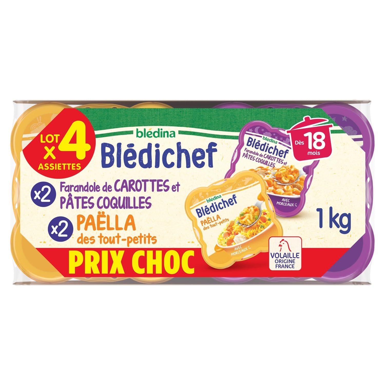 BLEDINA - Blédichef - 2 Paëlla des Tout-Petits plus 2 Farandoles de Carottes et Pâtes Coquilles - dès 18 Mois - 4 Assiettes 250 g