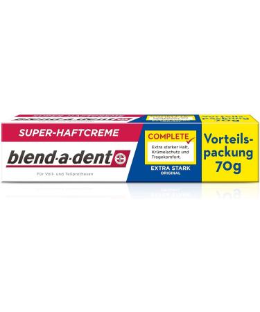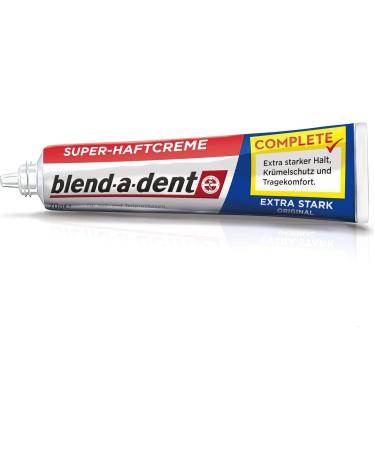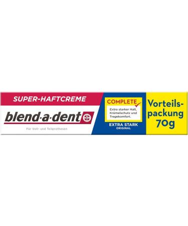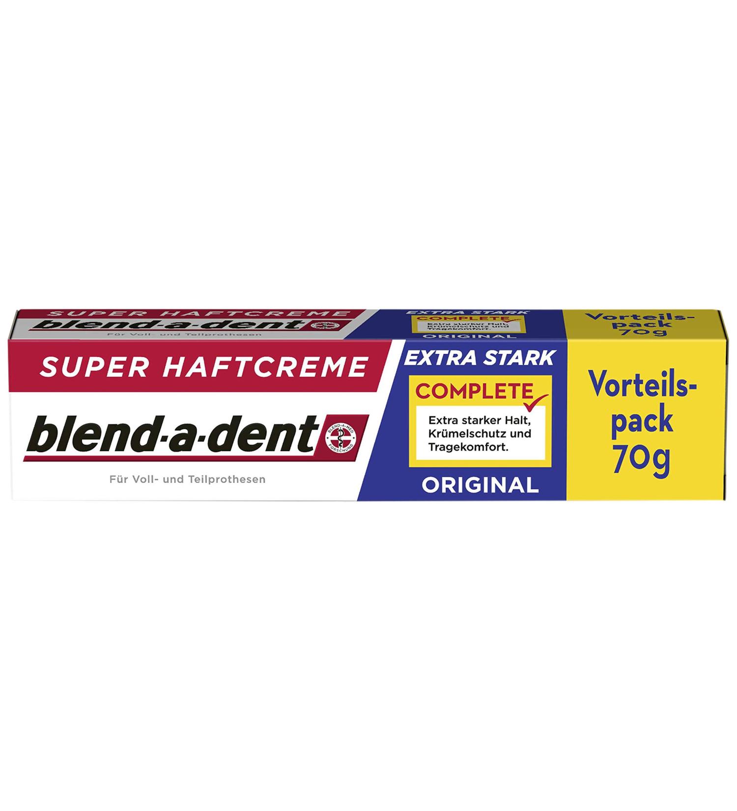 Blend-a-Dent Complete Proke's liability is ideal for you if you don't want to think about your denture.With everything you do and eat, you can enjoy self -confidence, which is based on the fact that your dental prosthesis is comfortable and keeps it safely.Blend-a-Dent Complete offers strong hold and optimal wearing comfort throughout the day thanks to a cushion between gums and prosthesis.It creates a crumb protection seal against the penetration of food particles under the dental prosthesis.So you can relax and enjoy life fully.Now with a mild mint taste. Ingredients / ingredients Calcium/Zinc PVM/MA Copolymer, paraffinum Liquidum, Cellulose Gum, Petrolatum, Silica, CI 14720, aroma, menthol, CI 16185, Limonene Warnings N More for full and partial dentures.10 x stronger support by using detention cream.Comprehensive solution with three advantages of strong hold, increased comfort and crumb protection.Blend-a-Dent detention cream with a slight mint taste offers optimal all-round protection. blend-a-dent Complete Prothesen-Haftmittel ist ideal für Sie, wenn Sie nicht an Ihre Zahnprothese denken möchten. Bei allem, was Sie tun und essen, genießen Sie das Selbstvertrauen, welches darauf beruht, dass Ihre Zahnprothese komfortabel sitzt und sicher hält. blend-a-dent Complete bietet den ganzen Tag über starken Halt und optimalen Tragekomfort dank eines Polster zwischen Zahnfleisch und Prothese. Es erzeugt ein Krümelschutzsiegel gegen das Eindringen von Speisepartikeln unter die Zahnprothese. So können Sie entspannen und das Leben vollauf genießen. Jetzt mit mildem Minzgeschmack. INHALTSSTOFFE / ZUTATEN Calcium/Zinc PVM/MA Copolymer, Paraffinum Liquidum, Cellulose Gum, Petrolatum, Silica, CI 14720, Aroma, Menthol, CI 16185, Limonene WARNHINWEISE N MehrFür Voll- und Teilprothesen. 10 x stärkerer Halt durch die Anwendung von Haftcreme. Umfassende Lösung mit drei Vorteilen Starker Halt, erhöhter Tragekomfort und Krümelschutz. Blend-a-dent Haftcreme mit leichtem Minzgeschmack bietet einen optimalen Rundumschutz.Blend-a-dent Complete Original Super-Haftcreme (70 g) 1