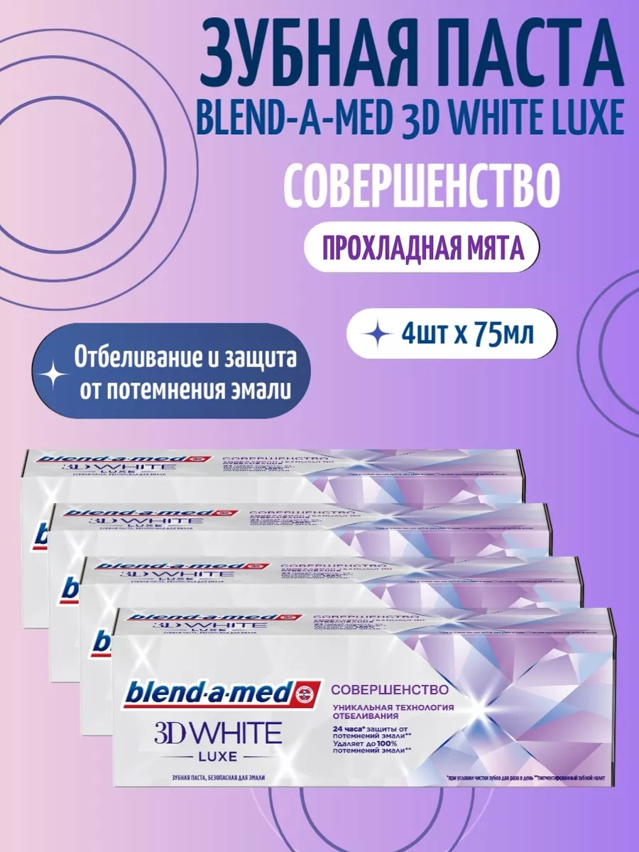 Зубная паста Blend-a-med 3D White Luxe Совершенство для отбеливания и защиты от потемнений эмали, прохладная мята, 4х75мл. Отбеливающая зубная паста Blend-a-med 3D White Luxe Совершенство дарит вам больше чем просто отбеливание. Паста удаляет до 100% потемнения эмали в том числе в труднодоступных местах. Кроме того, безопасная для эмали 3D White Luxe Совершенство помогает защитить зубы от появления пигментированного зубного налета на 24 часа при использовании пасты два раза в день во время чистки. Фтор, содержащийся в пасте, питает и укрепляет эмаль ваших зубов. Насыщенный вкус прохладной мяты для ощущения свежести надолго. Объем 4х75мл. Произведено в Германии. Срок годности 24 месяца с даты изготовления, указанной на упаковке. Состав: Glycerin, Hydrated Silica, Sodium Hexametaphosphate, Aqua, PEG-6, Aroma, Silica, Sodium Lauryl Sulfate, Cocamidopropyl Betaine, Trisodium Phosphate, Mica, Chondrus Crispus Powder, Sodium Saccharin, PEG-20M, Sodium Fluoride, Xanthan Gum, Sodium Chloride, CI 77891, Sucralose, Limonene, Sodium Benzoate, CI 74160