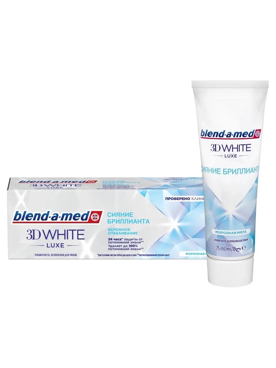 Blend-a-med 3D White Luxe, Зубная паста Сияние бриллианта 75 мл. Идеальное средство для вашего ежедневного ухода за зубами. Упаковка содержит 75 мл этой пасты. Она обеспечивает мягкое отбеливание вашей эмали и придает бриллиантовое сияние вашей улыбке. Позвольте зубной пасте Blend-a-med 3D White Luxe подарить вашим зубам красоту и здоровье. Обладайте уверенностью в себе и осуществляйте свои цели с яркой и сияющей улыбкой благодаря зубной пасте Blend-a-med 3D White Luxe. Эффективно отбеливает зубы. Защищает зубную эмаль. Имеет приятный мятный аромат. Борется с распространением бактерий в полости рта.