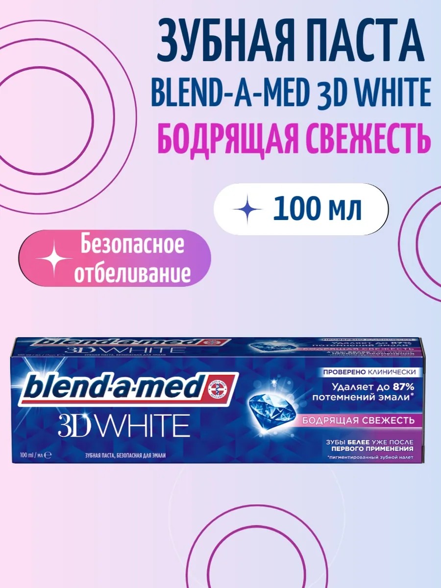 Зубная паста Blend-a-med 3D White Бодрящая Свежесть для безопасного отбеливания, 100 мл. Отбеливающая зубная паста Blend-a-med 3D White Бодрящая свежесть с нашей уникальной формулой, разработанной со стоматологами, делает зубы белее уже после первого применения. Проверено клинически, что паста помогает удалять до 87% пигментированного зубного налета. Кроме отбеливания, эта паста дарит вашей полости рта бодрящую свежесть благодаря вкусу свежей мяты. Безопасна для эмали. Объем 100 мл. Произведено в Германии. Срок годности 24 месяца с даты изготовления, указанной на упаковке. Состав: Aqua, Sorbitol, Hydrated Silica, Disodium Pyrophosphate, Sodium Lauryl Sulfate, Aroma, Sodium Hydroxide, Cellulose Gum, Sodium Saccharin, Sodium Fluoride, Mica, Carbomer, CI 77891, Limonene, Polysorbate 80, Tin Oxide