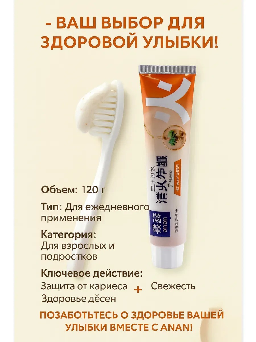 | Полное наименование товара | Зубная паста AnAn 120 г – антисептическая, травяная, освежающая дыхание, защита десен и профилактика кариеса |