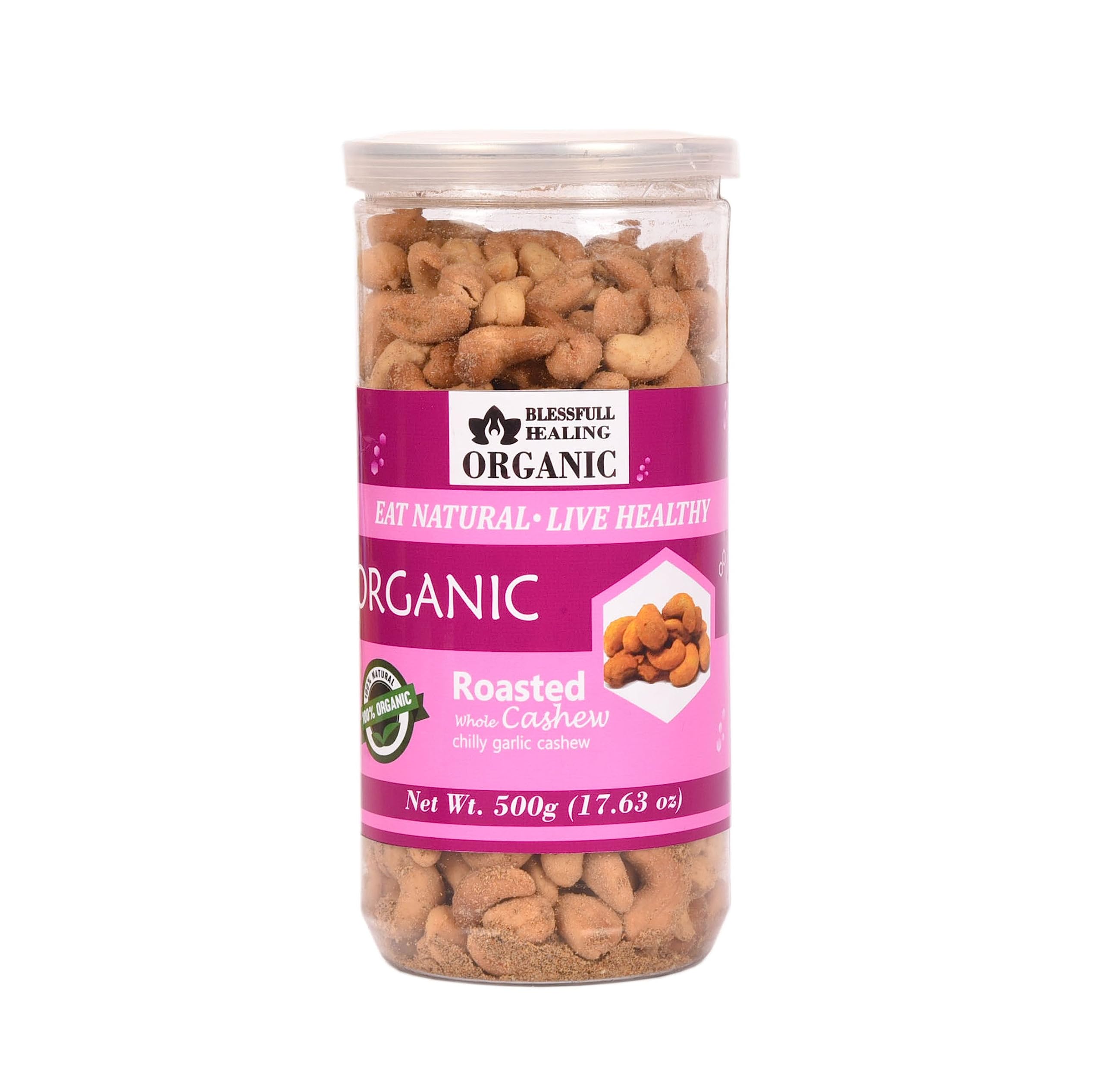 Blessfull Healing Organic Natural Vegan Chilly Garlic Roasted Whole Cashew Nuts Crunchy Kaju 500 Gram