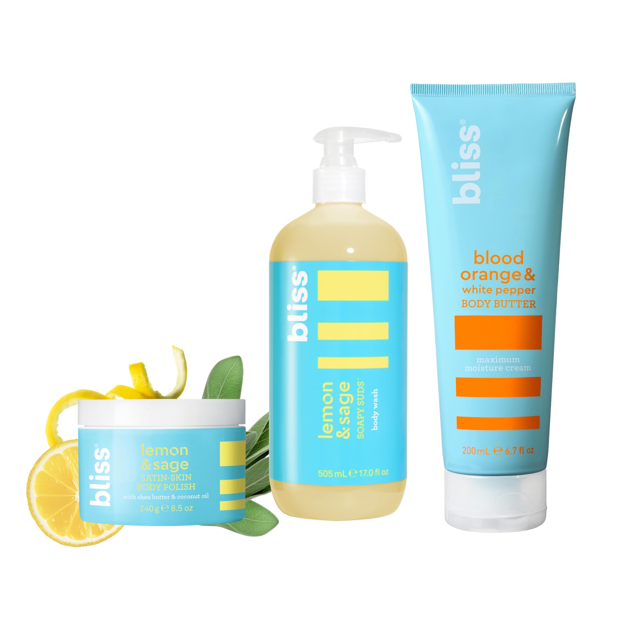 Bliss Body Summer Trio: Blood Orange and White Pepper Body Butter, Lemon and Sage Soapy Suds Body Wash and Satin-Skin Body Polish