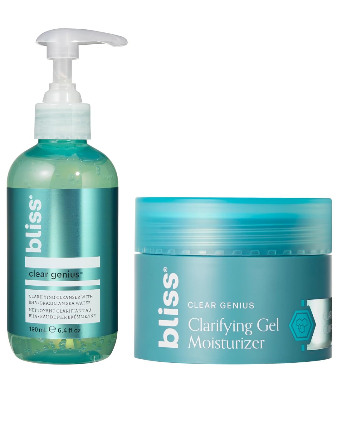 Deep clean and hydrate in one simple routine with this powerful blemish-fighting duo from Bliss. The Clear Genius Clarifying Gel Cleanser (6.4 oz) and Clarifying Gel Moisturizer (1.7 oz) are specially formulated for oily, combination, and acne-prone skin, using effective yet gentle ingredients to clarify, soothe, and hydrate. The gel cleanser features salicylic acid (BHA) to dissolve dirt, oil, and dead skin from pores, while calming agents help reduce redness and irritation. With a refreshing tea tree scent, this cleanser leaves skin feeling clean, balanced, and never tight or dry. The gel moisturizer is powered by CLARITY 5 Complex, blending niacinamide, witch hazel, and salicylic acid to refine texture, reduce excess shine, and deliver lightweight hydration that doesn't clog pores. Both products are vegan, cruelty-free, oil-free, and paraben-free, making them perfect for blemish-prone and sensitive skin types. Used together daily, this skincare pair helps support clearer skin and long-term balance.HOW TO APPLY Use the cleanser morning and night: massage into damp skin and rinse thoroughly. Follow with the gel moisturizer, applying evenly to face and neck. Use daily to maintain a healthy, clear, and hydrated complexion. VEGAN, CLEAN TEA TREE-INFUSED FOR A REFRESHING FEEL Infused with a natural tea tree scent, this duo is vegan, cruelty-free, oil-free, and free of parabens or sulfates, making it ideal for even sensitive, blemish-prone skin types. CLEARER, SOFTER SKIN IN TWO SIMPLE STEPS Use the cleanser to reset and refresh skin, then follow with the moisturizer to lock in hydration and maintain a balanced, shine-free complexion. Together, they help reduce blemishes, refine texture, and visibly improve clarity. LIGHTWEIGHT GEL MOISTURIZER TO HYDRATE TREAT Powered by CLARITY 5 Complex, this fast-absorbing moisturizer combines niacinamide, witch hazel, and salicylic acid to deliver soothing hydration while targeting acne, redness, and shine. PURIFYING GEL CLEANSER FOR ACNE-PRONE SKIN This refreshing cleanser uses salicylic acid (BHA) to deeply cleanse pores, remove dirt, excess oil, and impurities — without stripping or over-drying skin. Perfect for daily use to help reduce breakouts and prevent new ones from forming.