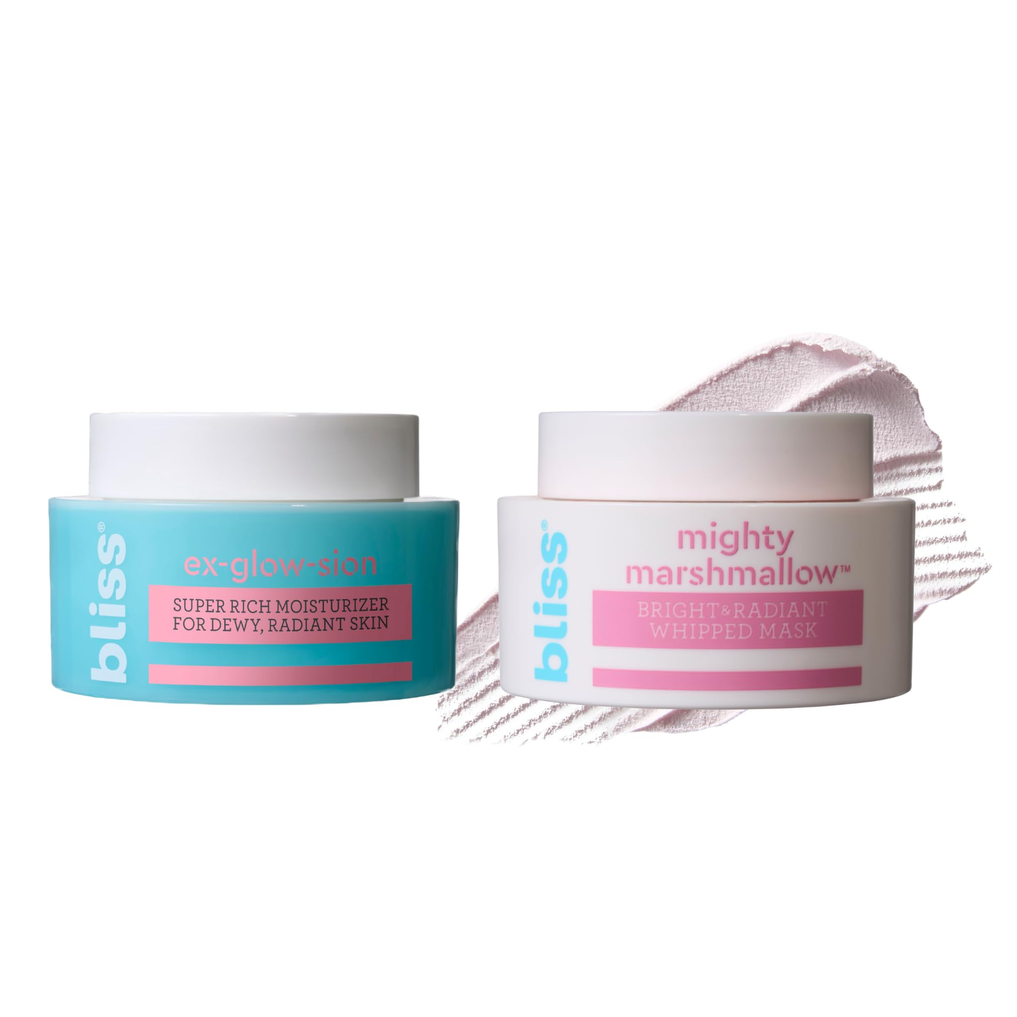 SIMPLE 2-STEP ROUTINE: Spa-quality results at home Step 1: Apply a thick layer of Mighty Marshmallow mask to clean, dry skin. Leave on for 10–15 minutes, then rinse. Step 2: Follow with Ex-Glow-Sion moisturizer to seal in hydration and reveal lasting, lit-from-within radiance. CLEAN, VEGAN CRUELTY-FREE: Conscious skincare that performs Formulated without parabens, phthalates, or SLS SLES. Both products are 100 vegan and cruelty-free, making this duo safe for sensitive skin and ethically minded routines. INTENSE HYDRATION FOR ALL SKIN TYPES: Especially dry or sensitive Whether your skin needs a deep moisture surge or daily hydration support, this bundle delivers. The whipped mask hydrates and soothes instantly, while the rich moisturizer keeps skin soft and supple from morning to night. POWERED BY VITAMIN C BOTANICAL EXTRACTS: For visibly brighter skin Both formulas are packed with brightening Vitamin C to promote a luminous, even skin tone. Marshmallow Root Extract and African Shea Butter work together to nourish, smooth, and revive dull, dry skin. GLOW-BOOSTING DUO: Brightening mask moisturizer for dewy, radiant skin Unleash your skin's glow with this radiance-enhancing skincare bundle. The Mighty Marshmallow mask deeply hydrates and brightens in just 15 minutes, while the Ex-Glow-Sion moisturizer locks in moisture and illuminates your complexion all day.