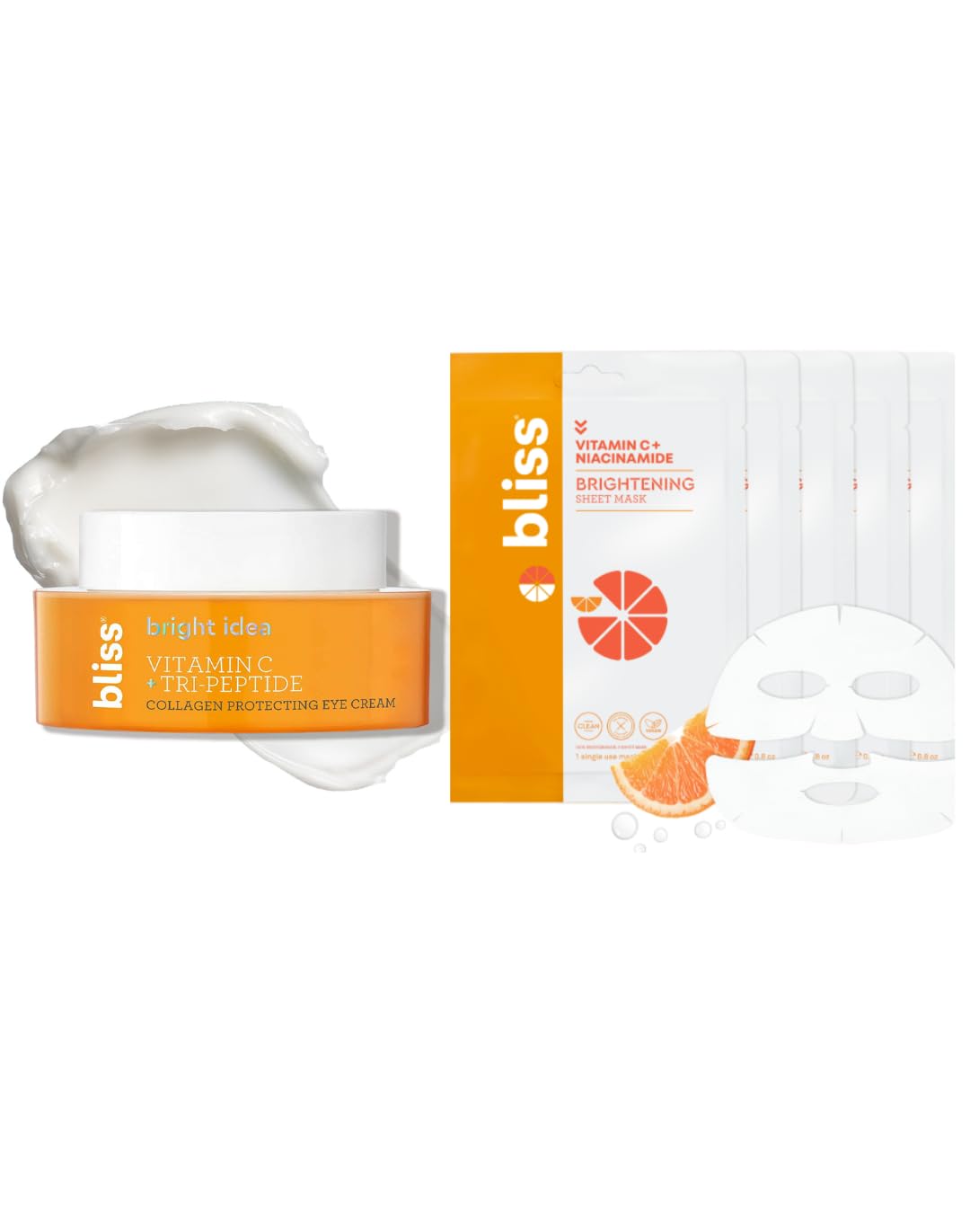 Bliss Vitamin C Radiance Eye & Face Set Bright Idea Eye Cream with Tri-Peptides + 5-Pack of Vitamin C Sheet Masks Brightening & Hydrating Skincare for Under Eyes and Full Face Glow