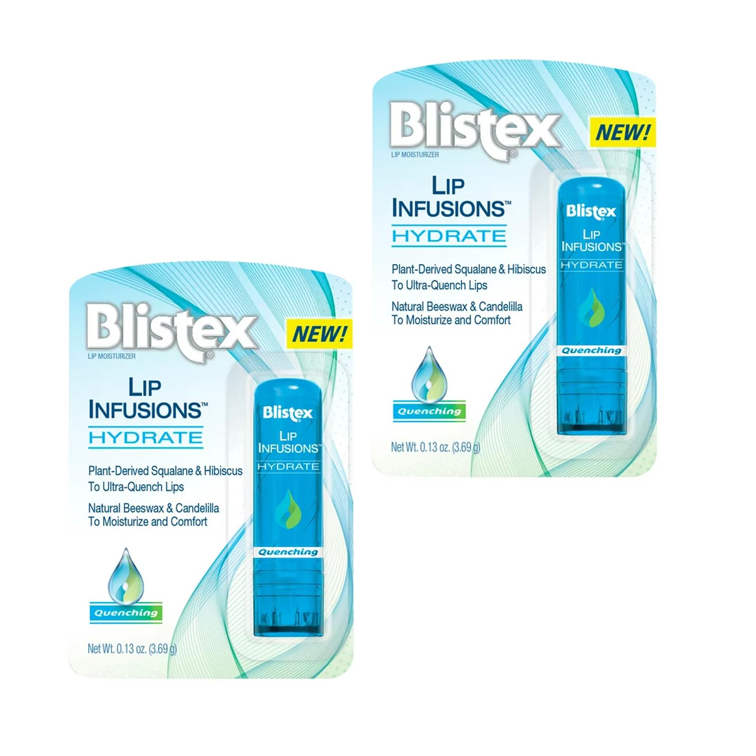New! Plant-derived squalene hibiscus to ultra-quench lips. Natural beeswax candelilla to moisturize and comfort. Quenching. Blistex Lip Infusions provide outstanding moisturization plus a special twist for your specific needs. It's great lip care you expect from Blistex, with an infusion of added extras for unparalleled benefits and experiences. Superb hydration conditioning for lips. Lip Infusions hydrate adds plant-sourced squalene and hibiscus extract to a richly moisturizing blend. Squalene and hibiscus provide emollient and nurturing benefits, for especially well-conditioned lips. Smooth finish. Lip Infusions is packed with coconut oil, candelilla and beeswax - the blend helps restore lips' moisture and leaves them soft and smooth. Satisfaction guaranteed. Card is 100 recyclable.