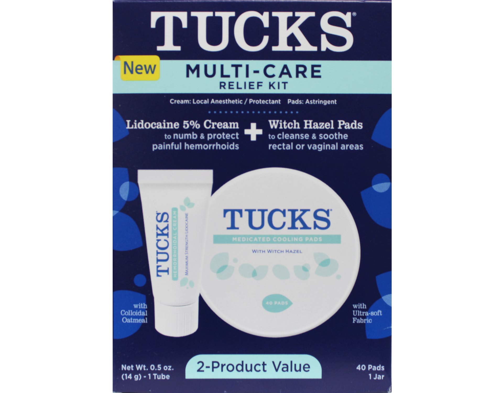 Experience comprehensive relief with the Tucks Multi-Care Relief Kit. This kit includes a 0.5 oz tube of lidocaine 5 cream with colloidal oatmeal, designed to numb and protect painful hemorrhoids, providing fast and effective relief. Additionally, the kit features ultra-soft witch hazel pads to cleanse and soothe rectal or vaginal areas. The combination of the powerful anesthetic cream and the gentle, soothing pads ensures optimal care and comfort for sensitive areas. Ideal for those seeking a complete solution to hemorrhoid discomfort, the Tucks Multi-Care Relief Kit offers the perfect balance of protection and relief.