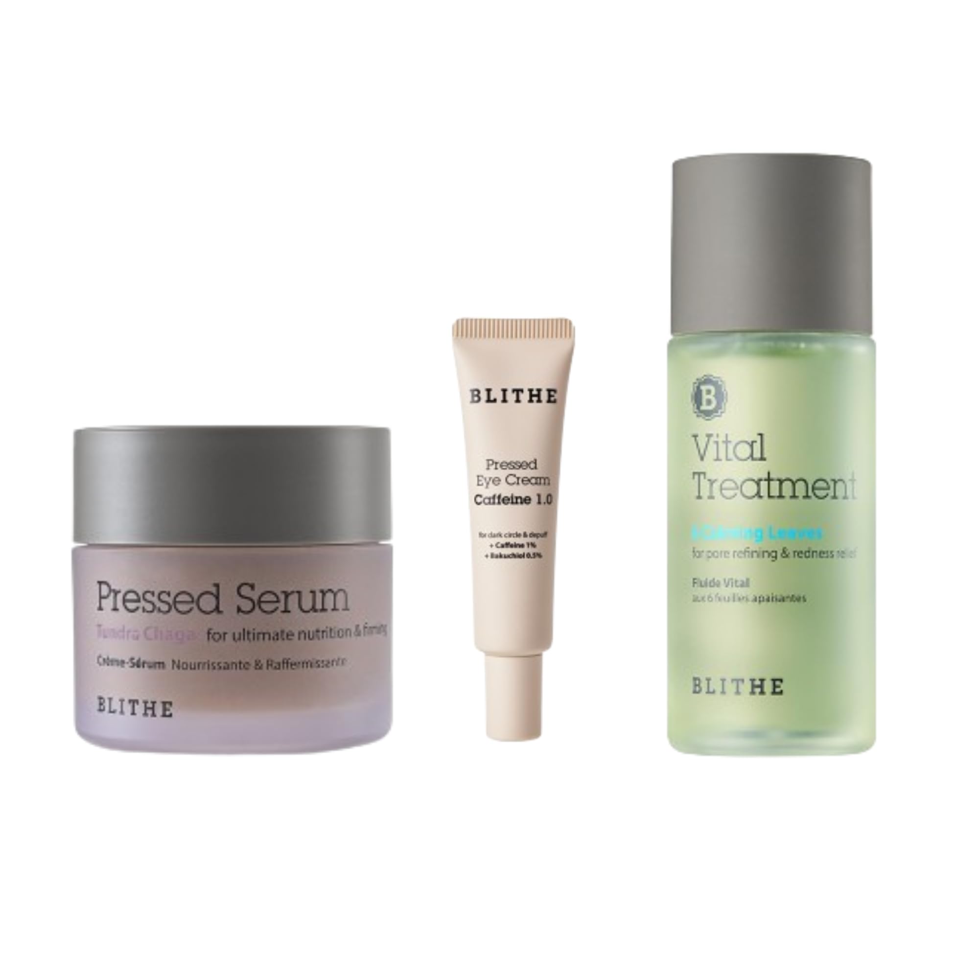 Blithe's transformative trio for radiant, healthy-looking skin. Refresh and soothe with Blithe Vital Treatment 6 Calming Leaves, a lightweight toner infused with botanical extracts to help balance and comfort sensitive skin. Enhance your routine with Blithe Caffeine Eye Cream, formulated with caffeine, bakuchiol, niacinamide, and sodium ascorbyl phosphate to visibly reduce the appearance of puffiness and tired eyes. Complete your regimen with Blithe Pressed Serum Tundra Chaga, a luxurious serum-moisturizer hybrid enriched with adenosine and beta-glucan to nourish, smooth, and improve skin elasticity.