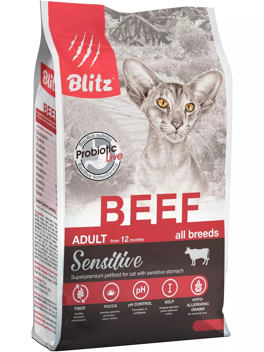 Корм Blitz Sensitive Beef для кошек, с говядиной, 2 кг. Blitz Sensitive Говядина сухой корм для взрослых кошек Blitz Sensitive Beef Adult Cats All Breeds Линия кормов Blitz Sensitive для кошек Сухой корм Блиц с говядиной ещё один мясной питательный рацион линейки Blitz Sensitive для кошек. Он подходит для каждодневного питания взрослых и пожилых животных и содержит абсолютно все питательные вещества, которые нужны им для здоровья и долголетия. Главная особенность корма Blitz Sensitive Beef Adult Cats использование легкоусвояемого, диетического мяса (говядины и индейки) и щадящих злаков (ячменя и риса), идеальных для кошек с нежным желудком и склонностью к аллергии. Что отличает корм Блиц Сенситив с говядиной для кошек? Говядина и индейка, при своей малой жирности, отличаются крайне богатым аминокислотным составом и содержат редкие микро- и макроэлементы (кобальт, селен, медь) в значимом количестве. Ни в одном виде мяса нет столько железа, как в говядине она особенно незаменима для ослабленных кошек. А индейка рекордсмен по содержанию триптофана, который положительно влияет на обмен веществ и гормональный фон животных. Ячмень и рис гиппоаллергенны, питательны и при этом обладают низким гликемическим индексом. В корм Blitz Sensitive Beef для кошек злаки добавлены в цельном виде с сохранением оболочки и зародыша зерна, что делает их ещё более полезными. Формула содержит живые бактерии Bacillus, нормализующую микрофлору кишечника животных, а кроме того усиливающие их действие пребиотики (инулин, MOS, FOS). Куриный и рыбий жир, входящие в состав рациона, обеспечивают потребности кошек в ненасыщенных жирных кислотах Омега-3 и Омега-6. С ними шерсть ваших питомцев будет блестящей, а кожа здоровой. Правильный баланс минеральных веществ способствует здоровью мочевыделительной системы кошек