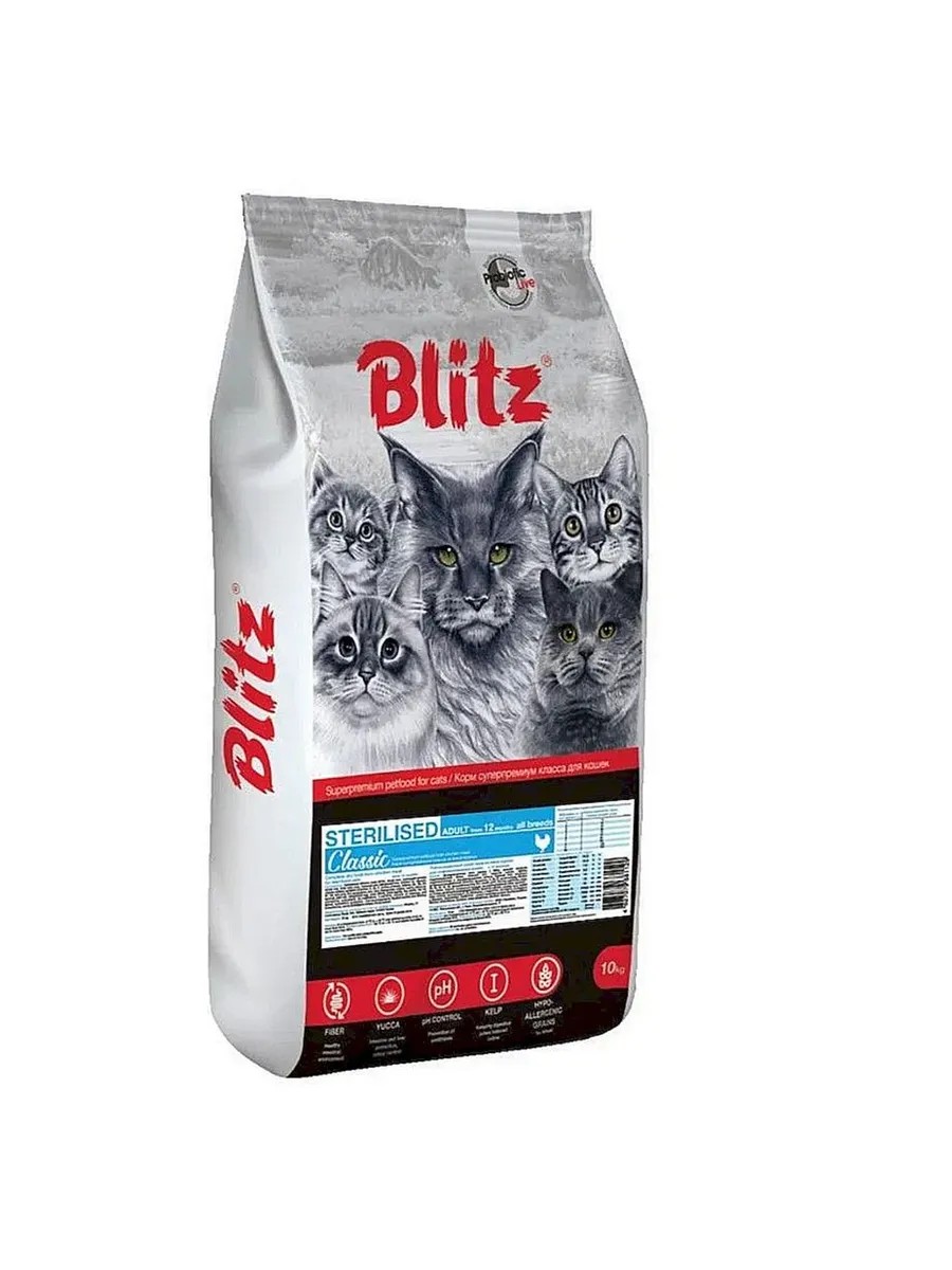 Blitz Sterilized Cats Chicken is a complete, super-premium dry food formulated to meet the needs of spayed and neutered cats. The diet is carefully balanced across all macro- and micronutrients and is suitable for regular feeding. The only additional care required is fresh water. Blitz Sterilized contains an optimal amount of protein and slightly less fat than other Blitz foods for adult cats. It is ideal for neutered pets, as well as sedentary cats prone to weight gain. Features of Blitz Sterilized cat food with chicken. This diet is based on boneless chicken. This type of meat is always a favorite among cats, and additional protein supplements—liver, eggs, and albumin—enrich the flavor and aroma of the food even more intense and appealing to these whiskered predators. In addition to meat, Blitz Sterilized Cats Chicken food includes plant-based ingredients beneficial for the digestion and peristalsis of domestic cats. Wholegrain rice is suitable for dietary feeding; it is hypoallergenic and has an extremely low glycemic index. Cranberry and DL-Methionine maintain optimal urinary pH in cats and reduce the risk of urolithiasis. Chicken and fish oil, supplemented with flaxseed, contain a full spectrum of omega-3 fatty acids, ensuring your cat's coat will shine and have enough energy for long playtimes and exploration. To maintain healthy intestinal microflora in cats, we use only live and resilient bacteria of the genera Bacillus subtilis and Bacillus licheniformis, as well as Jerusalem artichoke and dried apples, rich in inulin and pectin. Be sure to follow the feeding guidelines developed by our experts, because Blitz chicken food is simply irresistible, even for the pickiest cats!