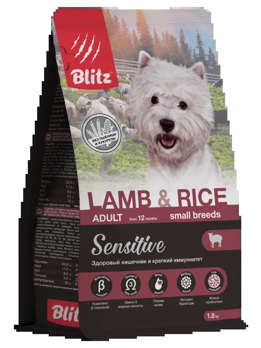 Blitz Sensitive Lamb & Rice Small Breeds Adult is a complete, super-premium dry food with a new formula, specially designed for adult small-breed dogs with sensitive digestion.