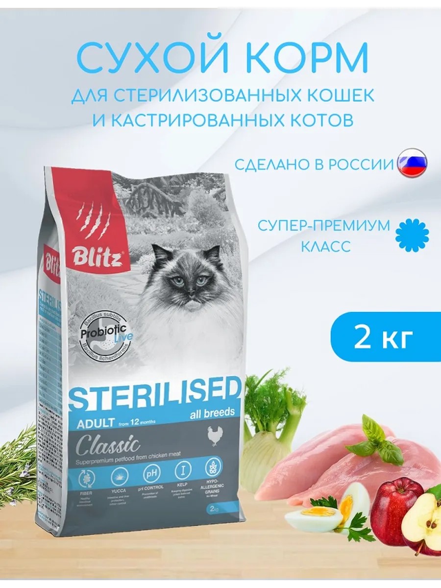 Особенности корма для кошек Blitz Sterilised с курицейВ основе рациона — бескостная курятина. Этот вид мяса неизменно любим кошками, а дополнительные белковые добавки — печень, яйца, альбумин — делают вкус и аромат корма ещё более насыщенным и притягательным для усатых хищников. Помимо мяса в состав корма Blitz Sterilised Cats Chicken включены растительные компоненты, полезные для пищеварения и перистальтики домашних кошек.